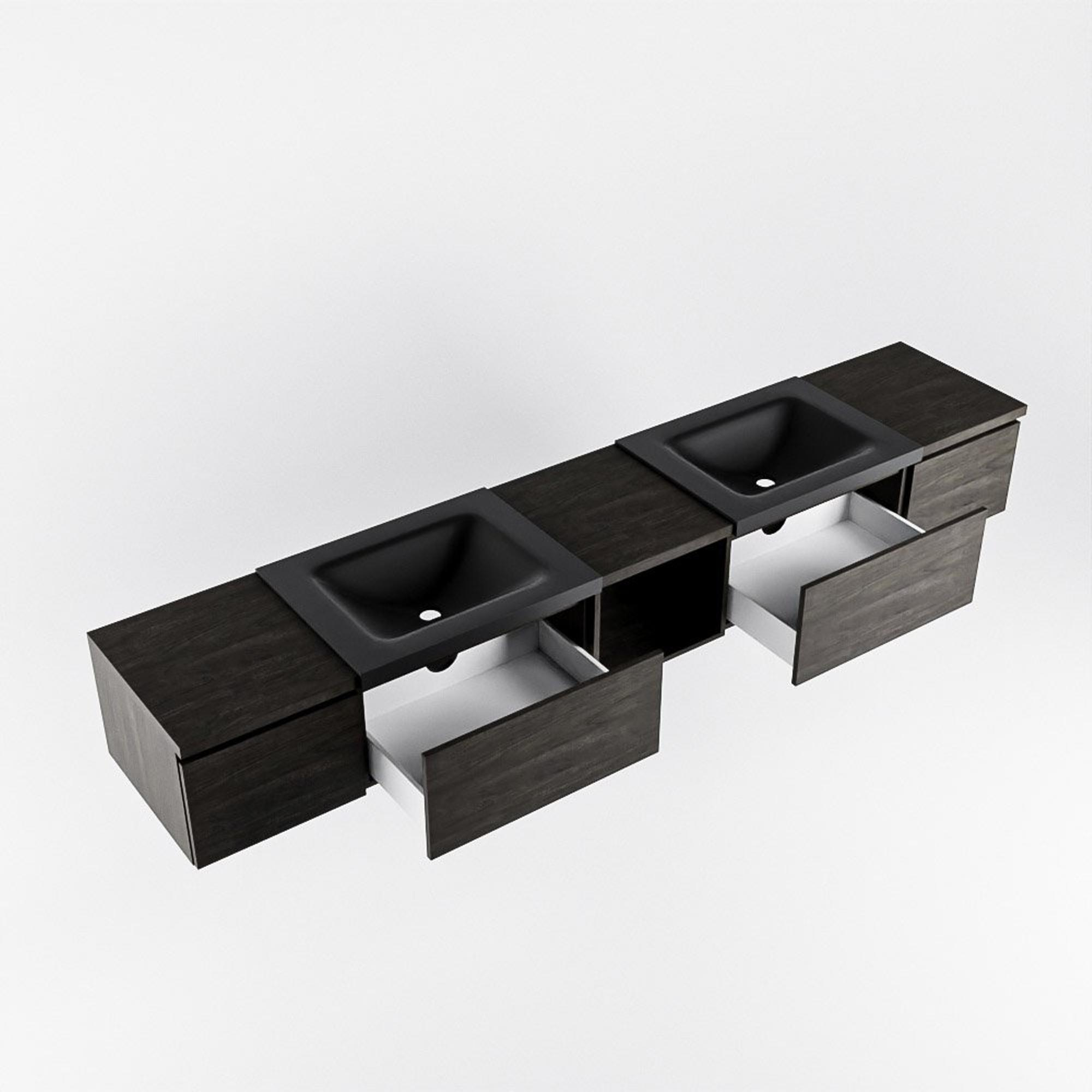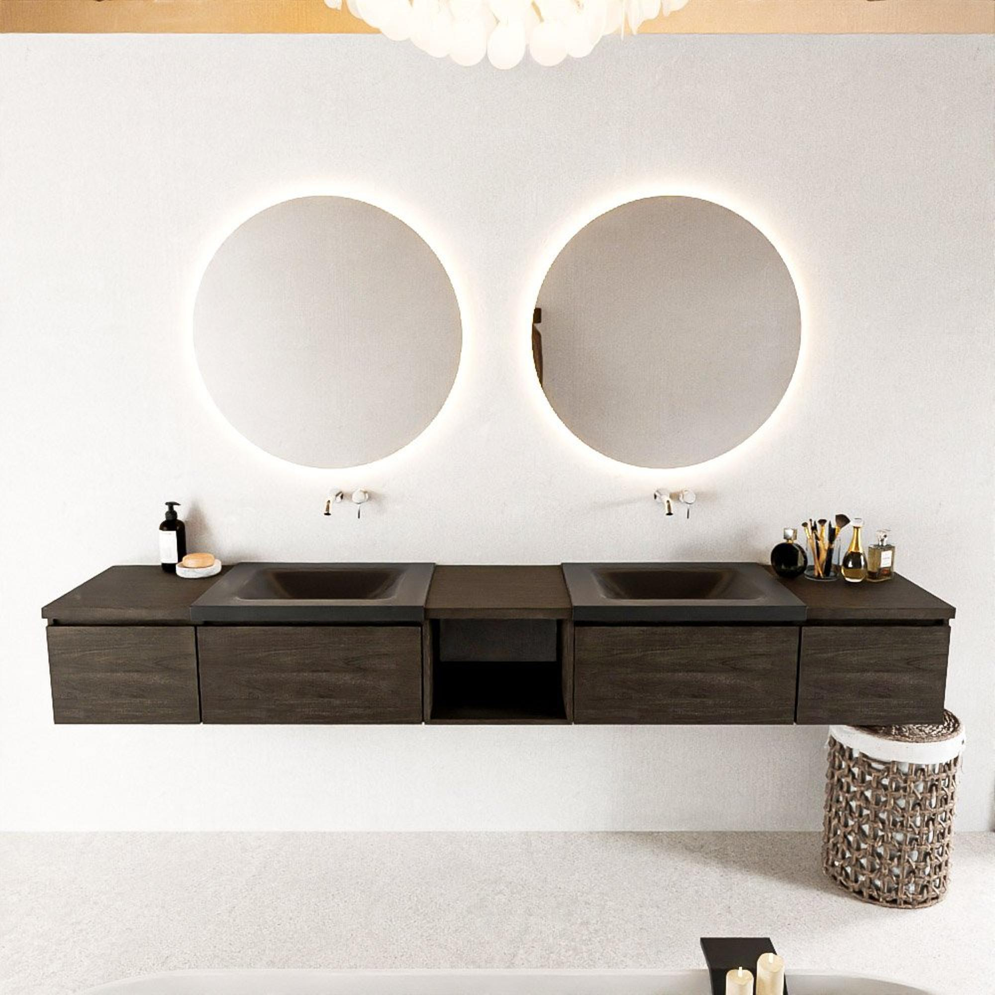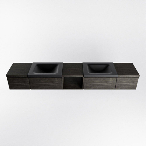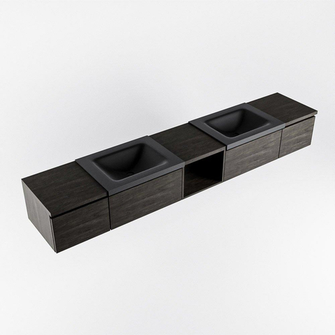 MONDIAZ BUKLA 240cm badmeubel met open module 40 midden kleur Dark Brown met 4 lades. Wastafel CLOUD dubbel 0 kraangaten kleur Urban.