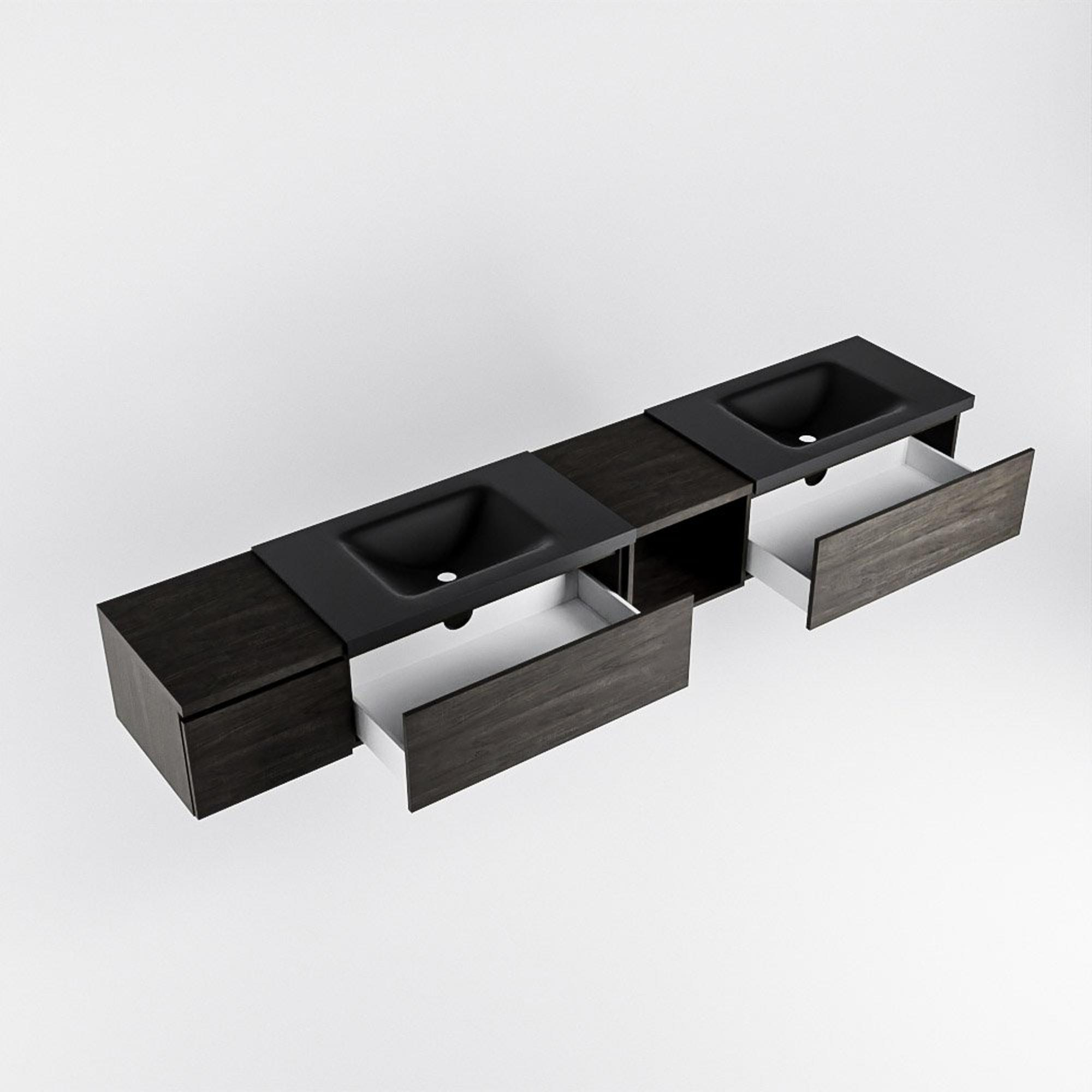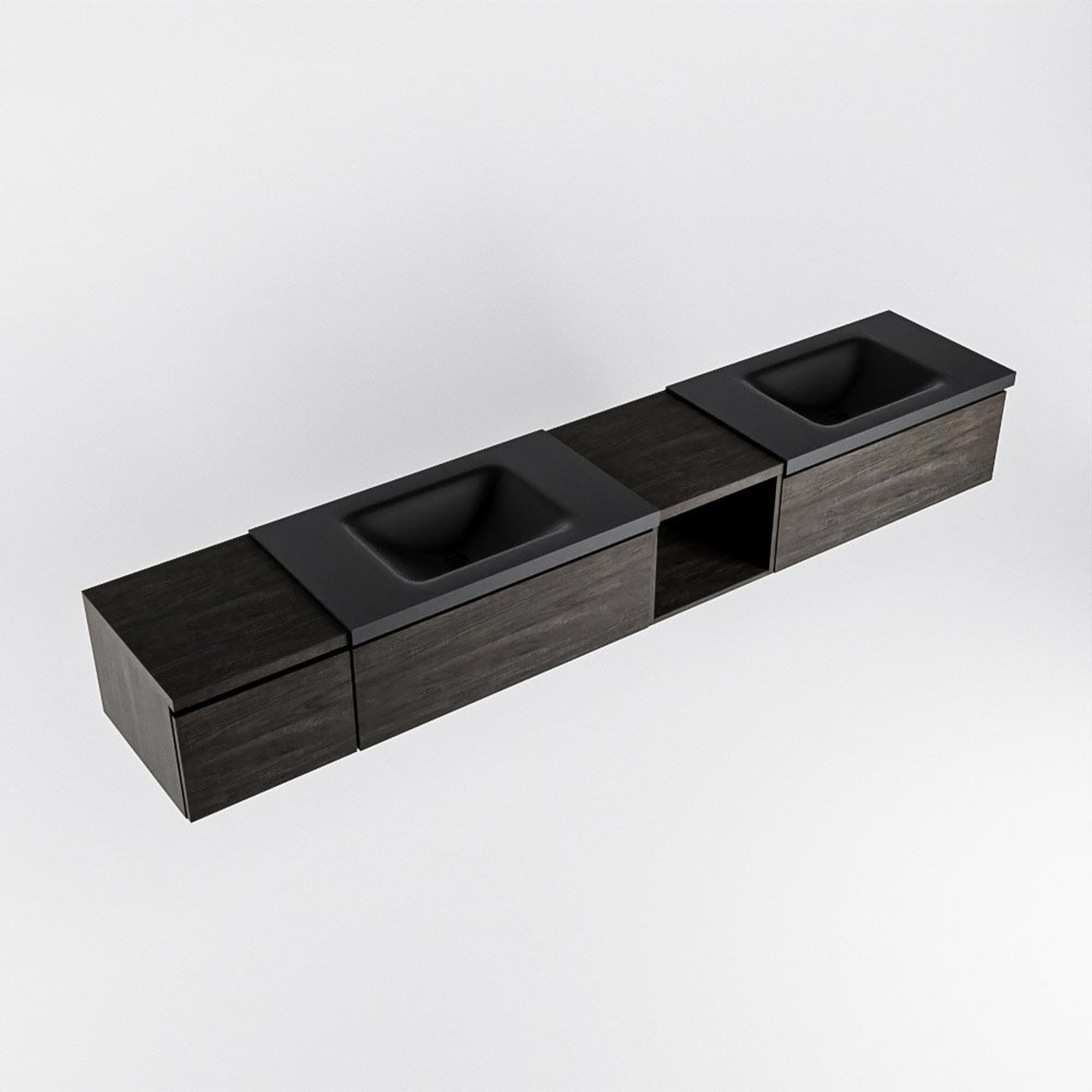 MONDIAZ BUKLA 240cm badmeubel met open module 40 rechts kleur Dark Brown met 3 lades. Wastafel CLOUD dubbel 2 kraangaten kleur Urban.