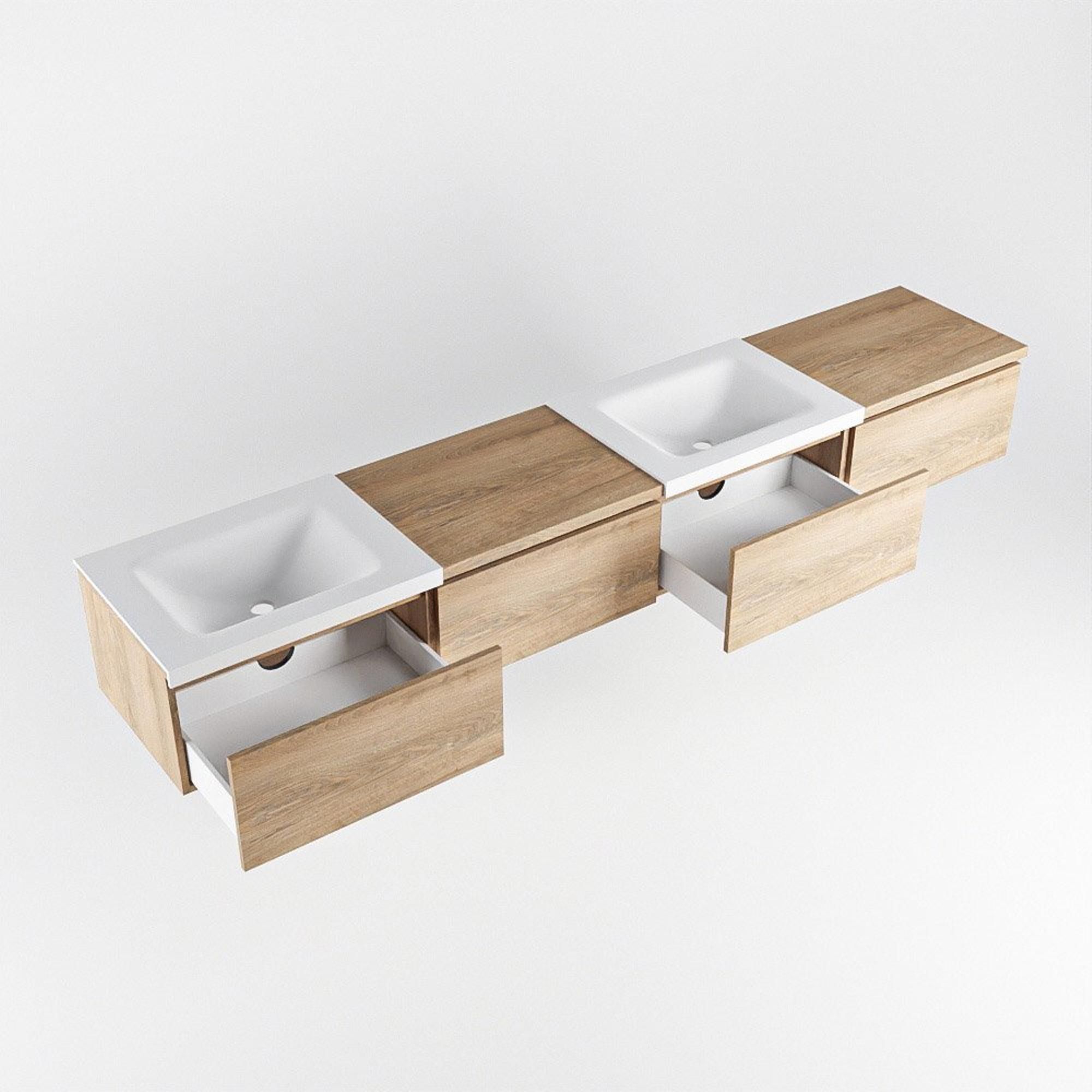 Naast zijn esthetische waarde is dit badmeubel ook uiterst praktisch in gebruik. De dubbele wastafel met 2 kraangaten maakt het mogelijk om comfortabel met twee personen tegelijkertijd gebruik te maken van de wastafel. De lades zijn voorzien van soepele geleiders en bieden een georganiseerde opbergoplossing voor al jouw toiletartikelen en handdoeken.