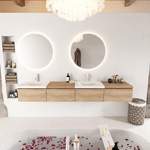 Dit badmeubel straalt elegantie uit met zijn verfijnde ontwerp en prachtige afwerking. De combinatie van de Washed Oak kleur en de dubbele wastafel in Talc zorgt voor een tijdloze en chique uitstraling. De 4 lades bieden voldoende opbergruimte voor al jouw badkamerbenodigdheden, terwijl de module aan de rechterkant extra functionaliteit toevoegt aan het geheel.