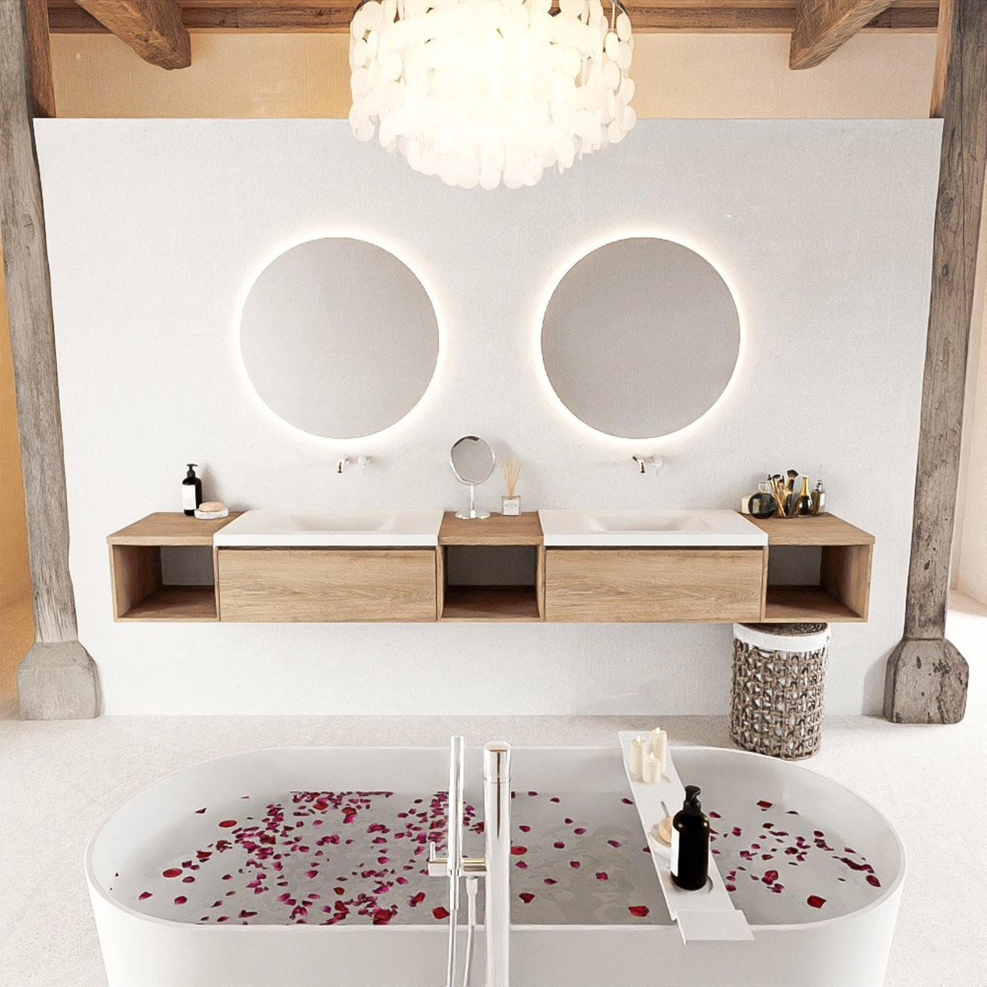 MONDIAZ BUKLA 280cm badmeubel met open module 40 L+M+R kleur Washed Oak met 2 lades. Wastafel CLOUD dubbel 0 kraangaten kleur Talc.