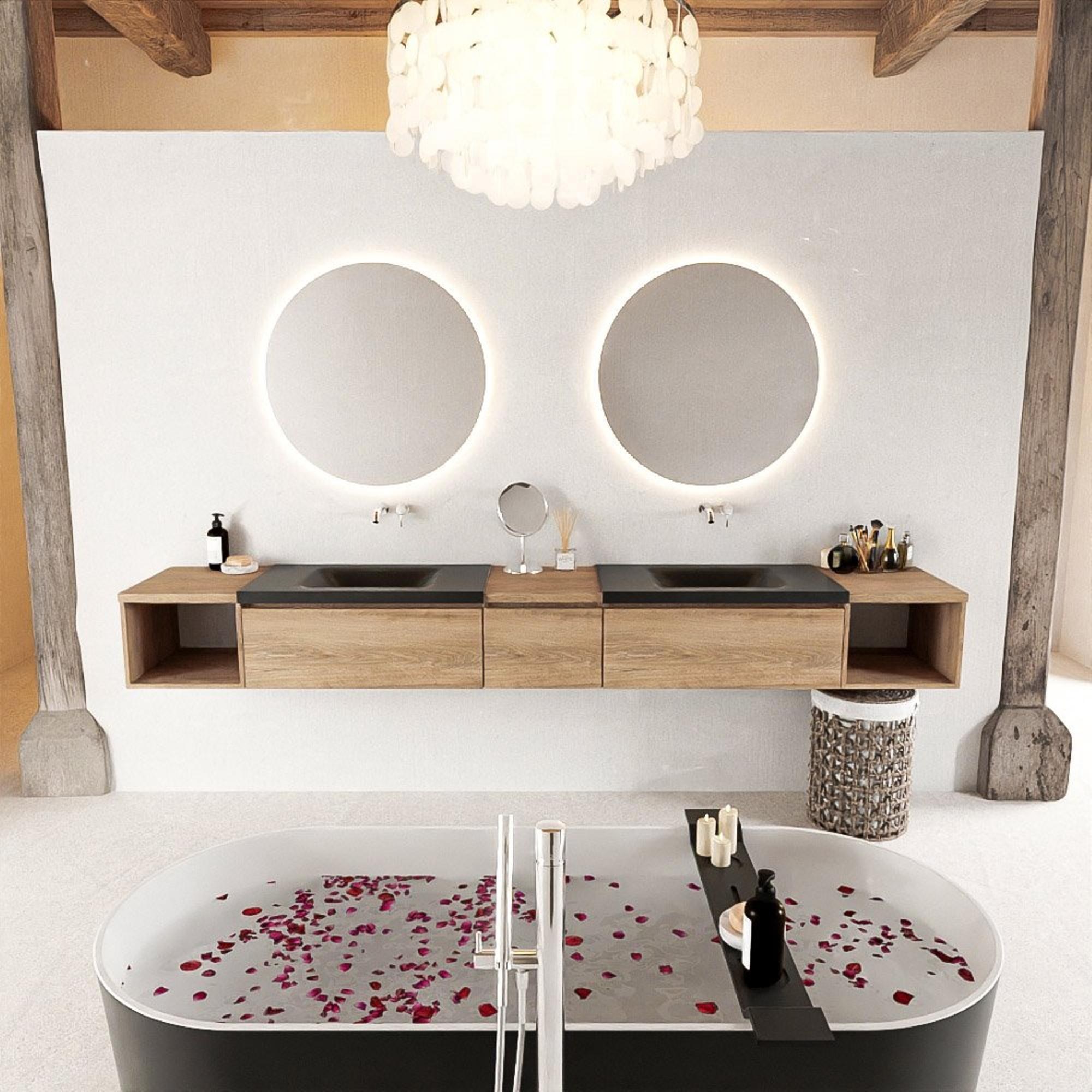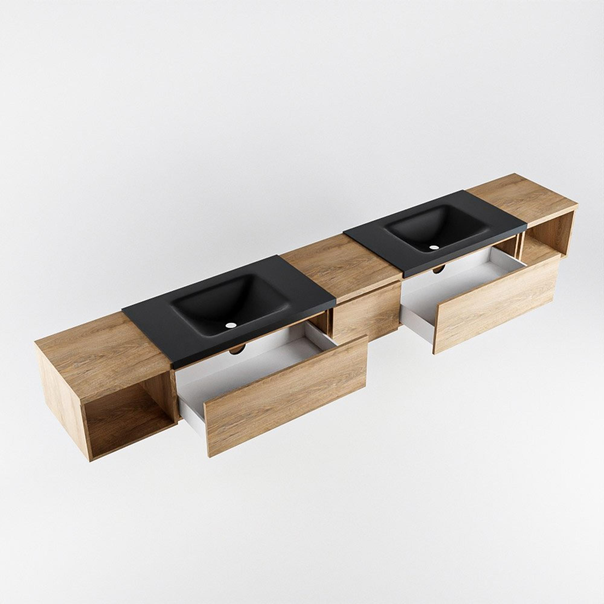 MONDIAZ BUKLA 280cm badmeubel met open module 40 L+R kleur Washed Oak met 3 lades. Wastafel CLOUD dubbel 0 kraangaten kleur Urban.
