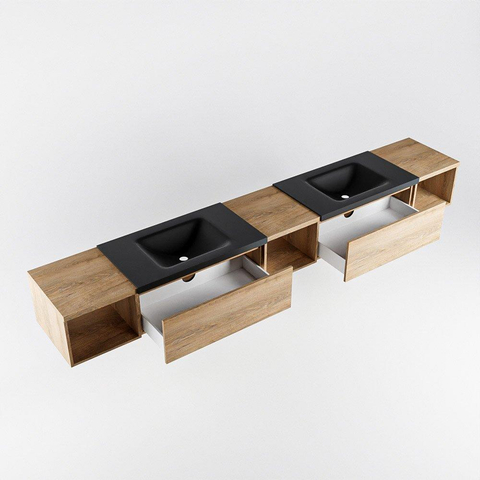 MONDIAZ BUKLA 280cm badmeubel met open module 40 L+M+R kleur Washed Oak met 2 lades. Wastafel CLOUD dubbel 2 kraangaten kleur Urban.