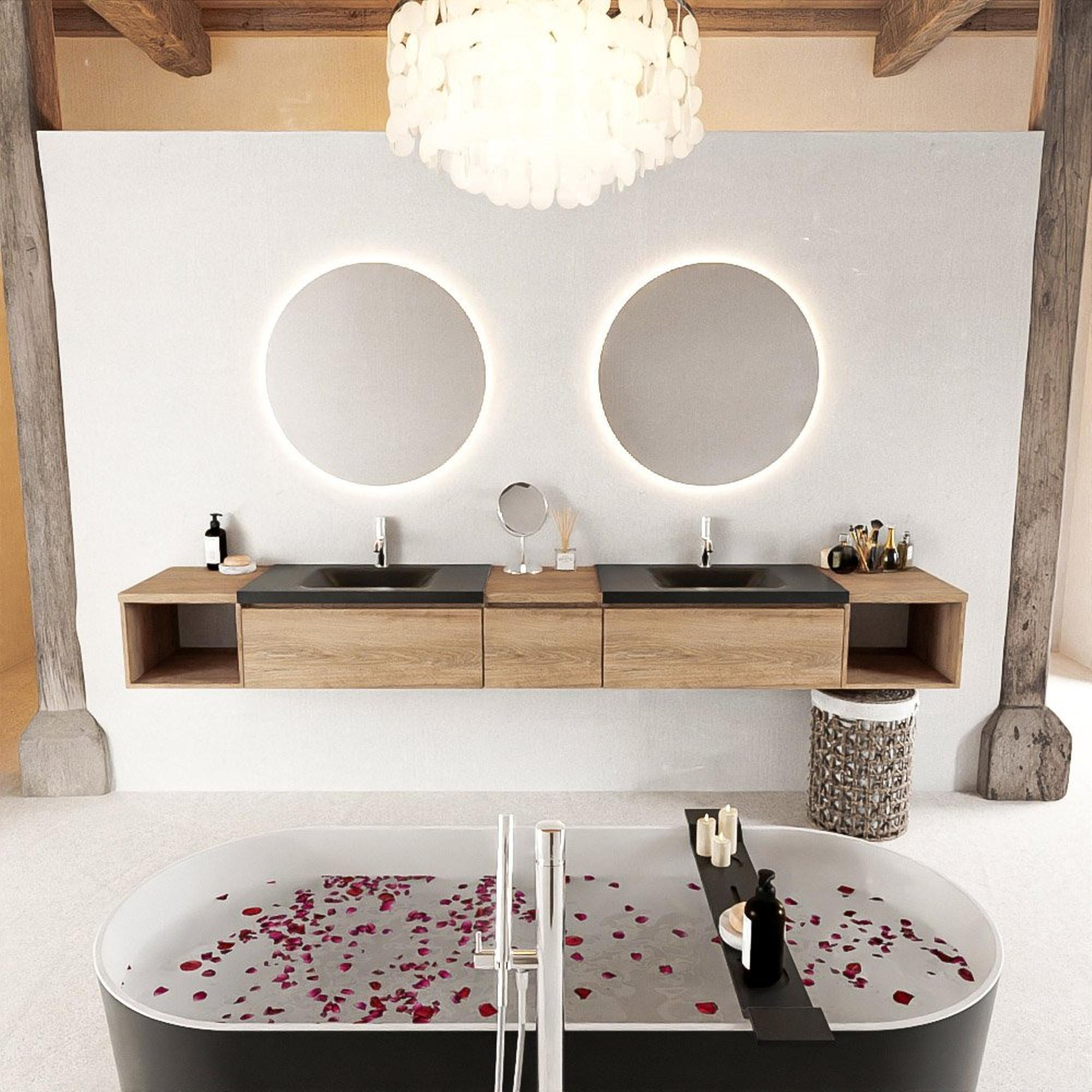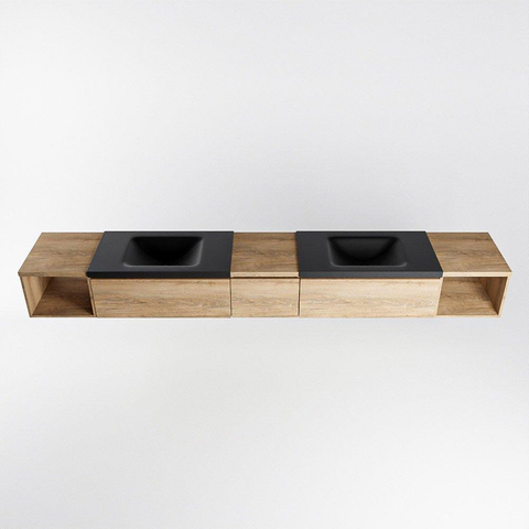 MONDIAZ BUKLA 280cm badmeubel met open module 40 L+R kleur Washed Oak met 3 lades. Wastafel CLOUD dubbel 2 kraangaten kleur Urban.