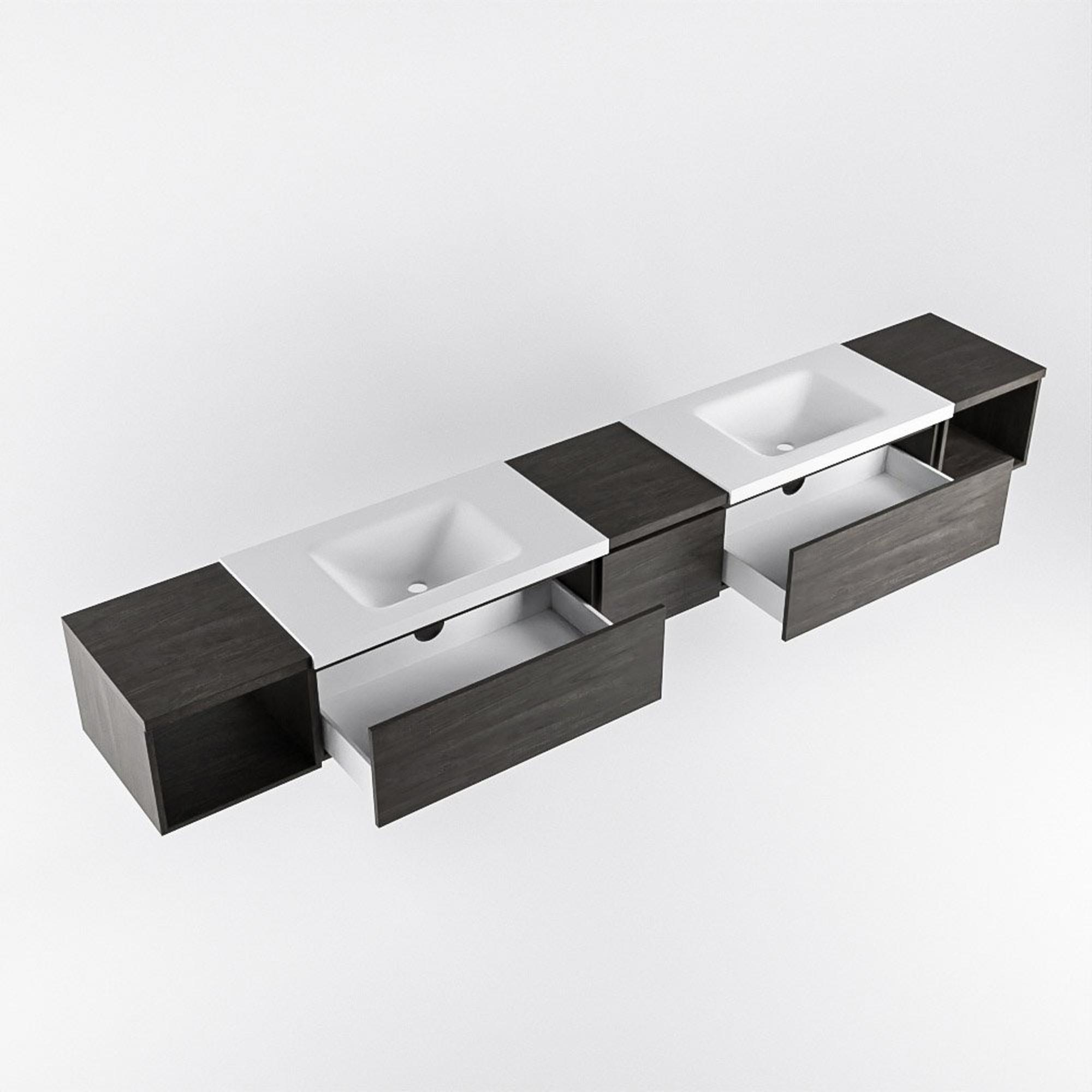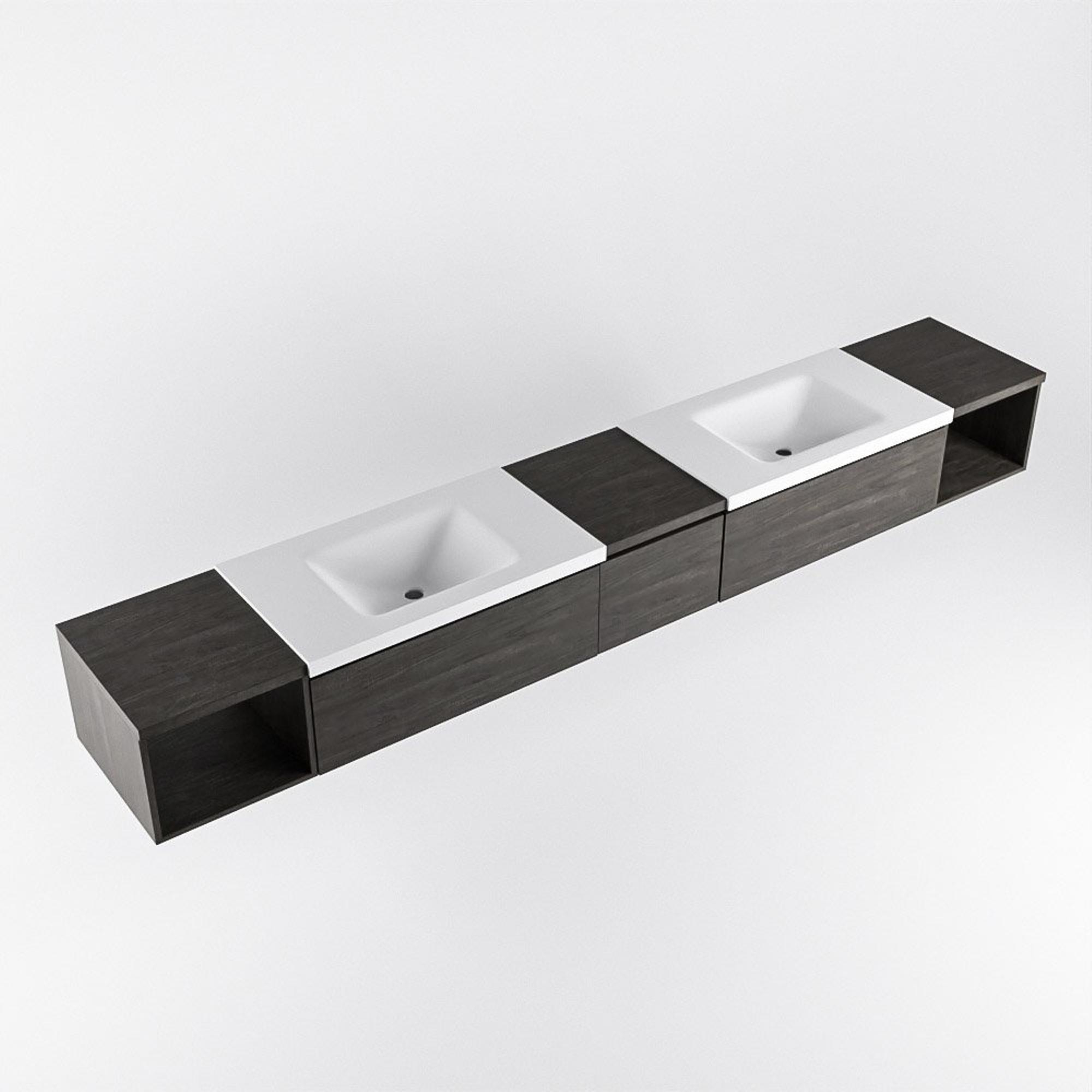 MONDIAZ BUKLA 280cm badmeubel met open module 40 L+R kleur Dark Brown met 3 lades. Wastafel CLOUD dubbel 2 kraangaten kleur Talc.