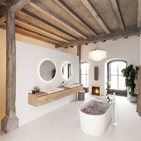 Dit badmeubel ademt luxe uit met zijn 280cm breedte en 5 ruime lades, perfect voor het opbergen van al je badkamerbenodigdheden. De Washed Oak afwerking geeft een warme en uitnodigende uitstraling, terwijl de dubbele wastafel met 2 kraangaten in de kleur Talc een vleugje elegantie toevoegt aan de ruimte.