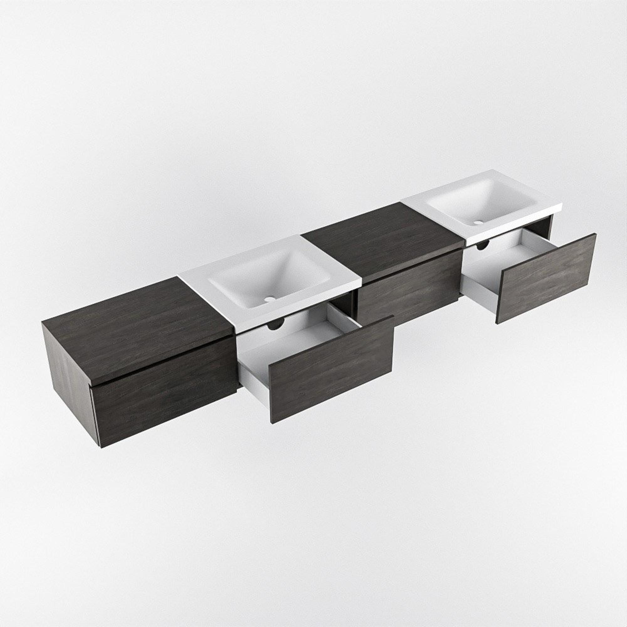 Naast zijn esthetische waarde is dit badmeubel ook zeer functioneel. De ruime lades zijn voorzien van hoogwaardige railsystemen voor soepele opening en sluiting, terwijl de module extra opbergruimte biedt voor handdoeken of andere benodigdheden. De dubbele wastafel is gemaakt van duurzaam materiaal en biedt voldoende ruimte voor twee personen om tegelijkertijd gebruik van te maken, waardoor het ideaal is voor drukke ochtenden.