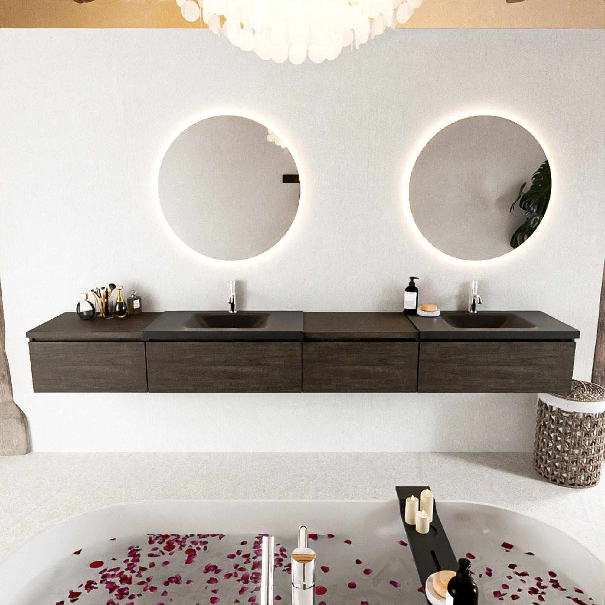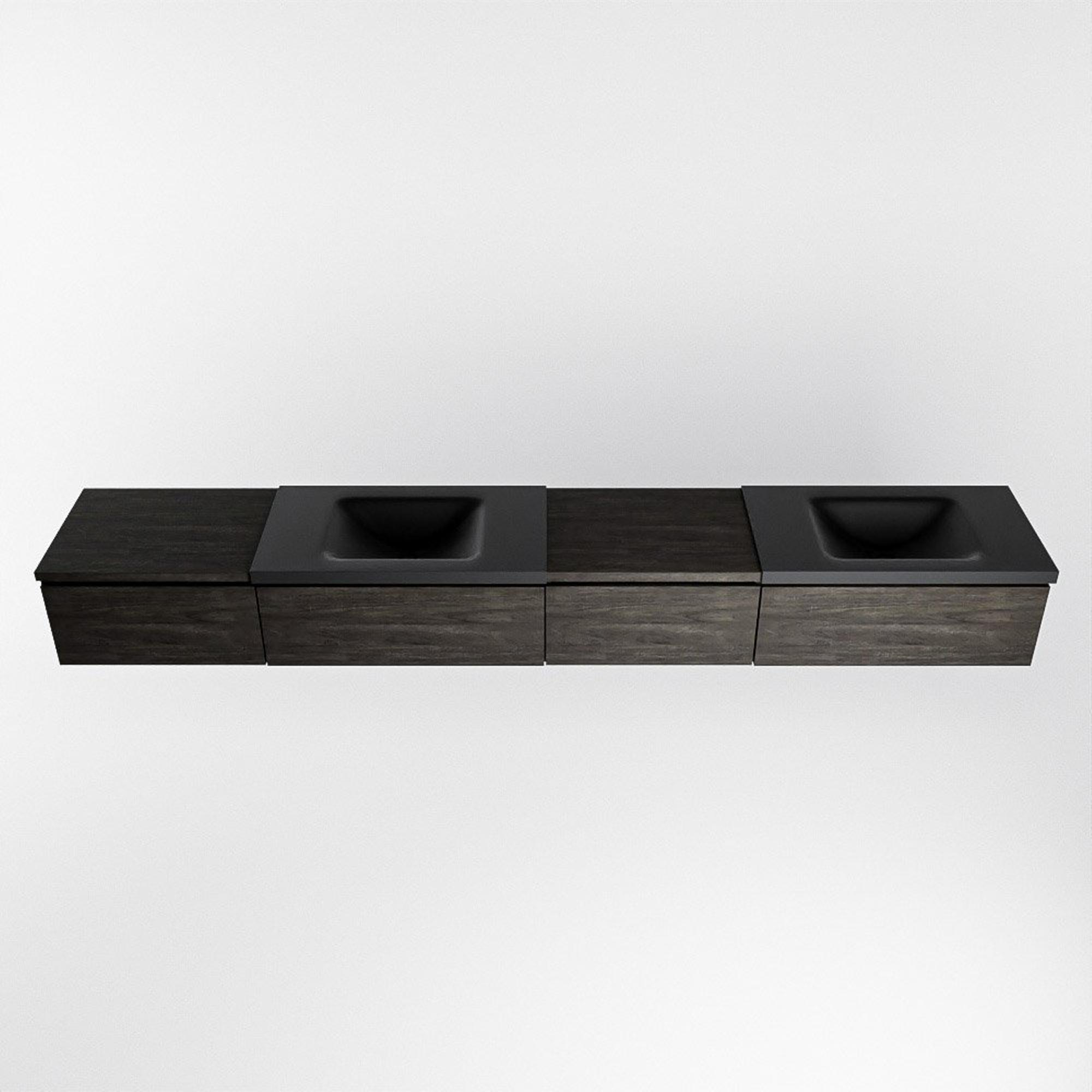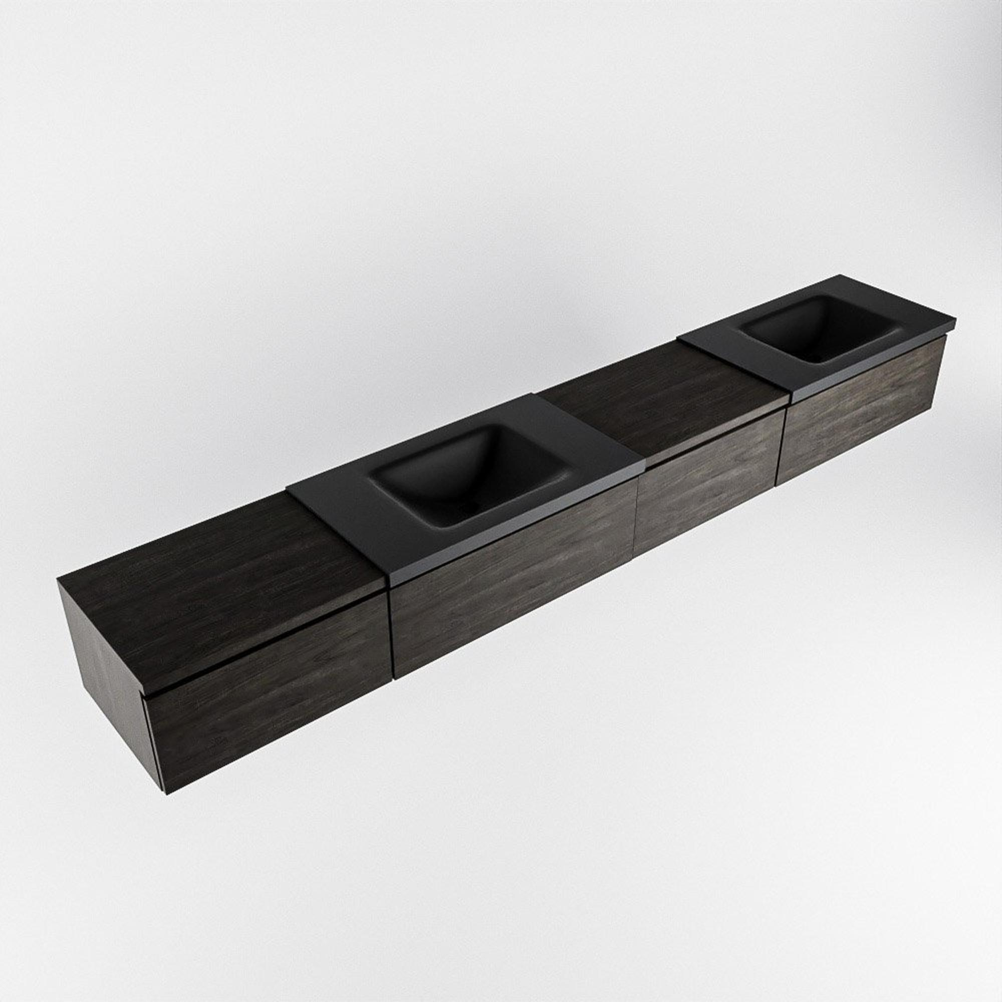 MONDIAZ BUKLA 280cm badmeubel met module 60 rechts kleur Dark Brown met 4 lades. Wastafel CLOUD dubbel 2 kraangaten kleur Urban.