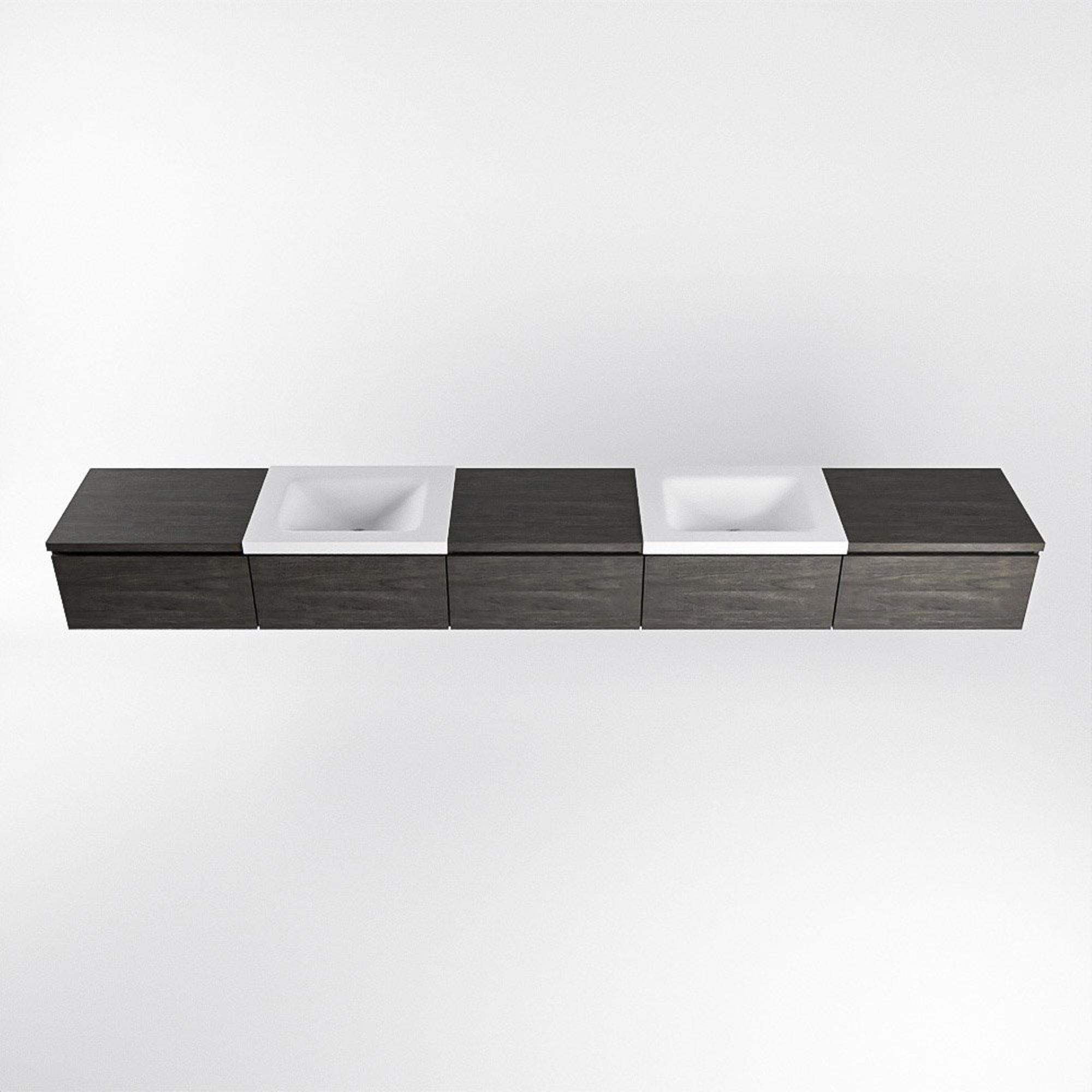 MONDIAZ BUKLA 300cm badmeubel met module 60 kleur Dark Brown met 5 lades. Wastafel CLOUD dubbel 0 kraangaten kleur Talc.