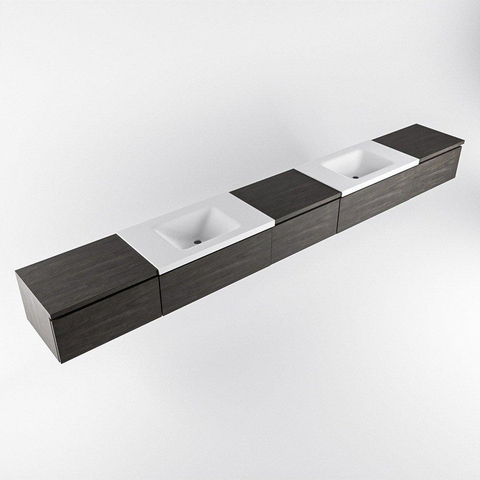 MONDIAZ BUKLA 340cm badmeubel met module 60 kleur Dark Brown met 5 lades. Wastafel CLOUD dubbel 0 kraangaten kleur Talc.