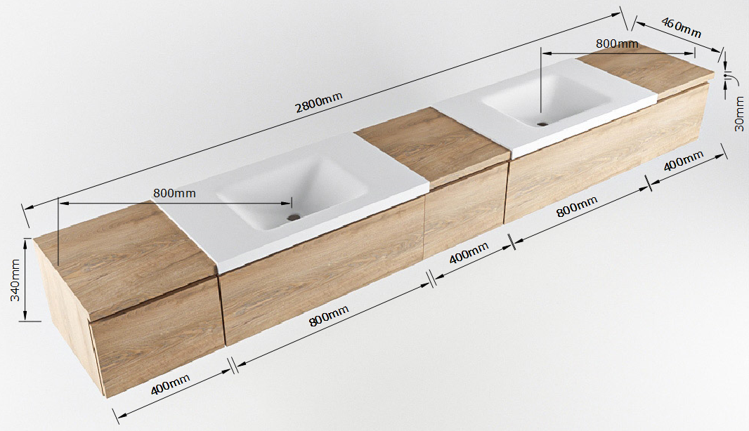 - Kleur: Washed Oak (badmeubel) en Urban (wastafel)