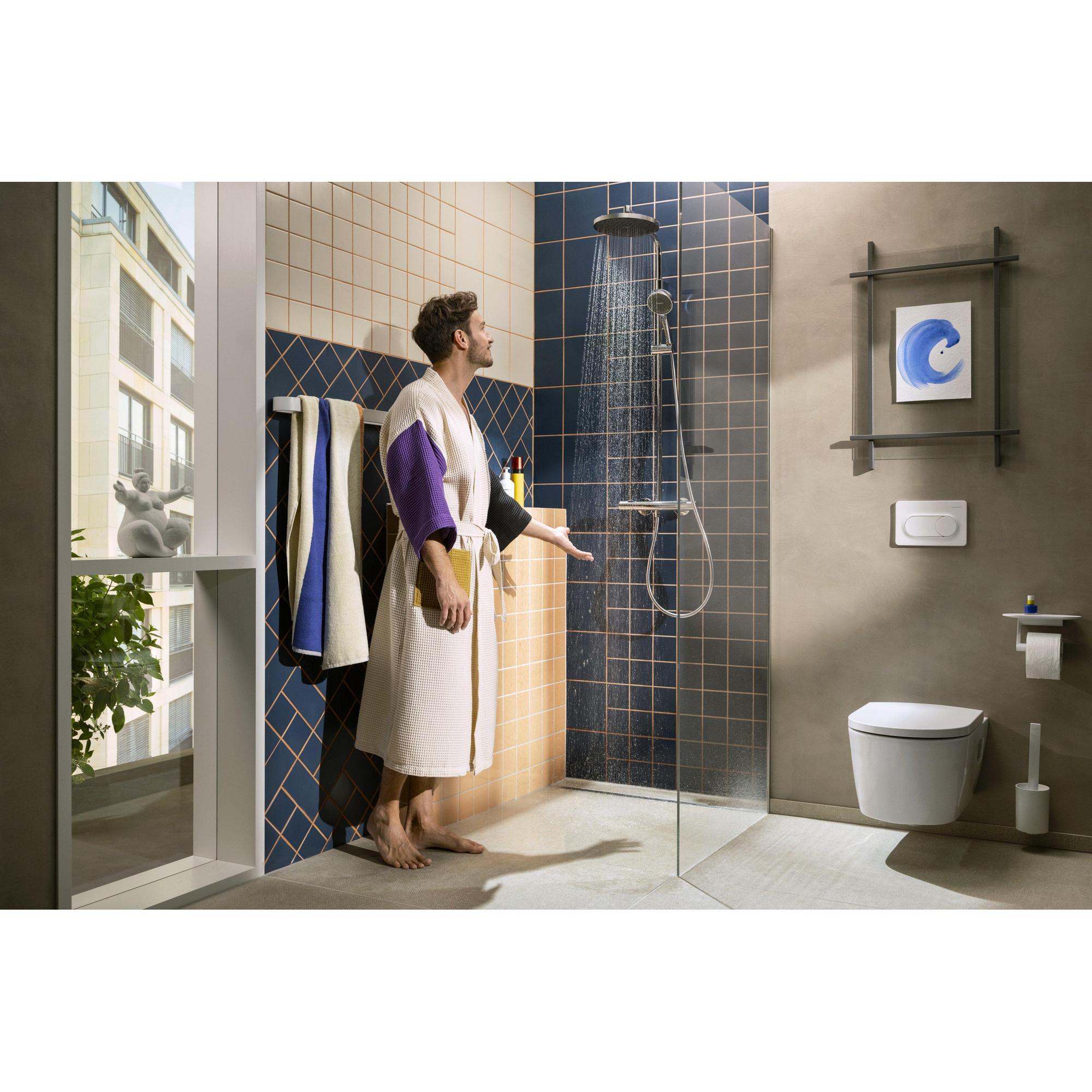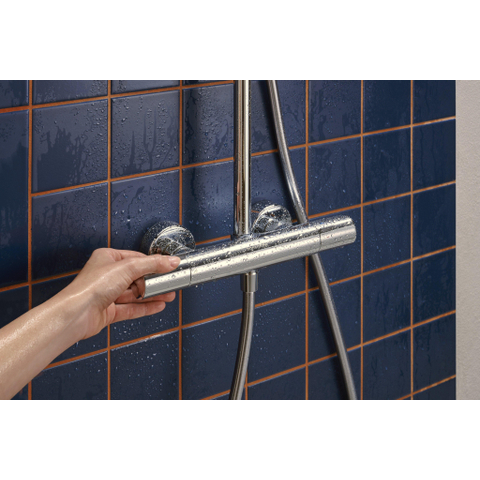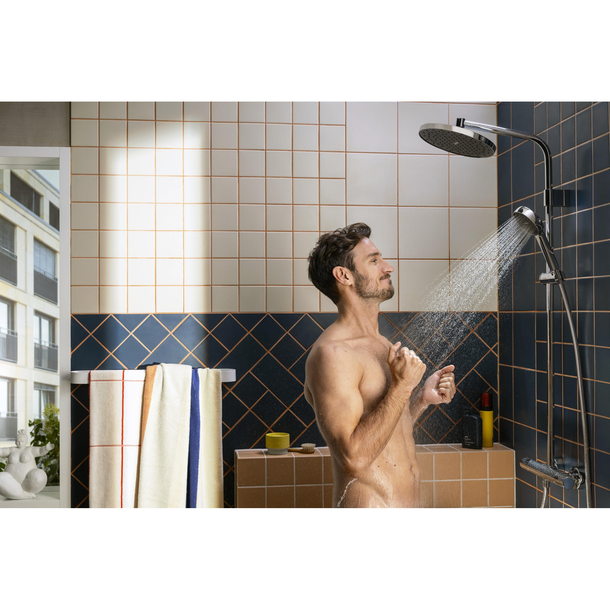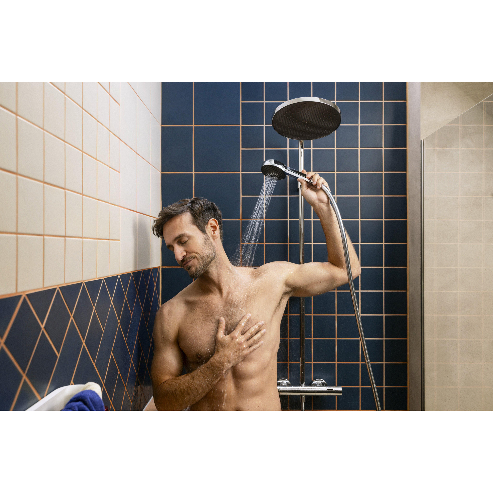 De combinatie van een hoofddouche en handdouche biedt maximale flexibiliteit. Met de handige Select-knop op de handdouche schakel je moeiteloos tussen verschillende straalsoorten, zoals Rain en ImpactRain, voor een persoonlijke douche-ervaring. Het schuifstuk is in hoogte verstelbaar en voorzien van een vergrendeling, zodat je de handdouche altijd op de juiste plek hebt. De thermostaat met veiligheidsblokkering bij 40°C zorgt voor een constante en veilige watertemperatuur, terwijl de SafetyFunctie voorkomt dat het water te heet wordt. Dit maakt douchen niet alleen comfortabel, maar ook veilig voor het hele gezin.