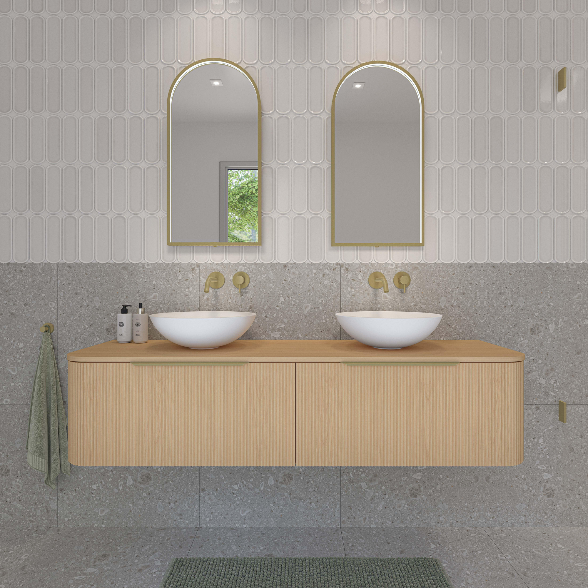 Door de combinatie van wandmontage, compacte hoogte en afgeronde hoek oogt deze onderkast opvallend licht en ruimtelijk. Omdat het meubel zwevend aan de muur hangt, houd je de vloer vrij en lijkt je badkamer groter en overzichtelijker. De afgeronde linkerhoek verzacht de lijnen van de ruimte en is extra prettig langs een looproute of in een kleinere badkamer, omdat je je minder snel stoot. De rechthoekige vorm met zachte rondingen sluit mooi aan bij moderne wastafels en minimalistische kranen. De lichte houtkleur zorgt bovendien voor een natuurlijke, rustige basis die je eenvoudig combineert met witte wastafels, zwarte accenten of bijvoorbeeld mat metalen kranen. Zo creëer je in één keer een stijlvolle basis voor je hele badkamermeubel.