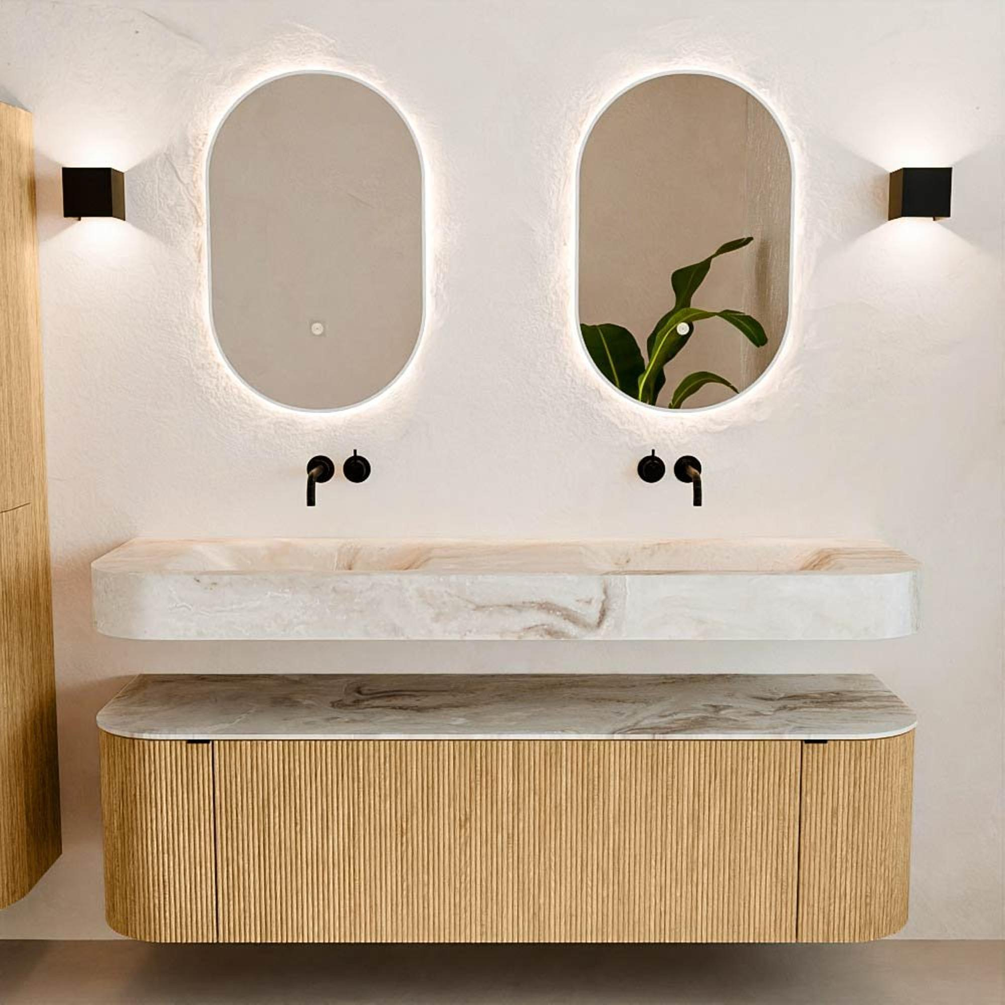 Natuurlijke materialen in warme tinten. De verticale ribbels brengen ritme en textuur in het ontwerp, terwijl het eikenhout zorgt voor een warme, ambachtelijke uitstraling. Kies uit 5 houttinten OAK, WALNUT, DUSK, SHADOW en RUBY zorgvuldig geselecteerde houtkleuren om zowel moderne als klassieke badkamers te verrijken.
