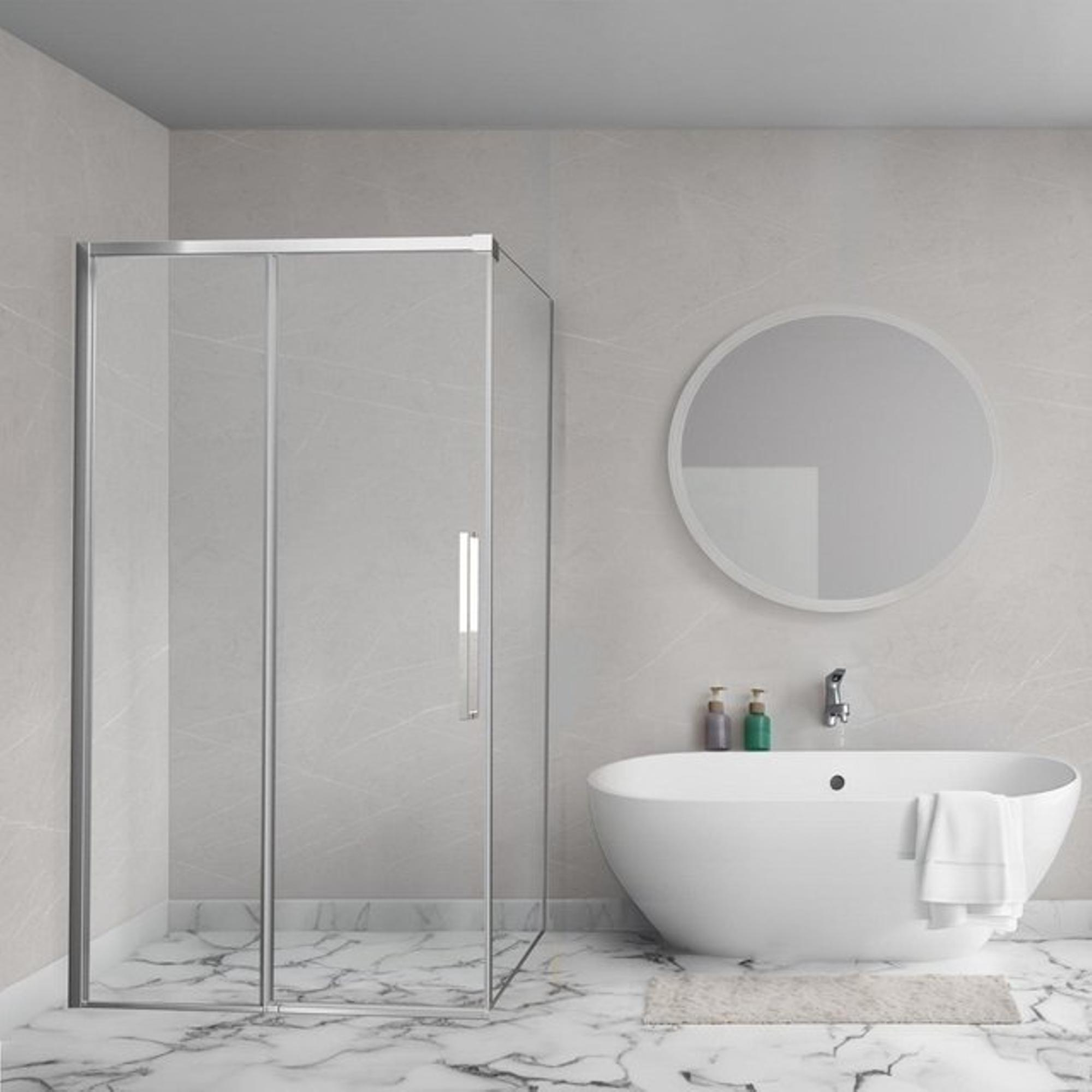 Deze zijwand straalt pure elegantie uit dankzij het heldere veiligheidsglas en de chroomkleurige afwerking. Het minimalistische design past naadloos in moderne badkamers, terwijl het tijdloze karakter ook goed samengaat met klassiekere stijlen. Door de transparantie van het glas blijft je badkamer licht en ruimtelijk, wat een rustgevende sfeer creëert. Zo voeg je niet alleen een praktisch element toe, maar ook een stijlvolle blikvanger die jouw badkamer een upgrade geeft zonder te overheersen.