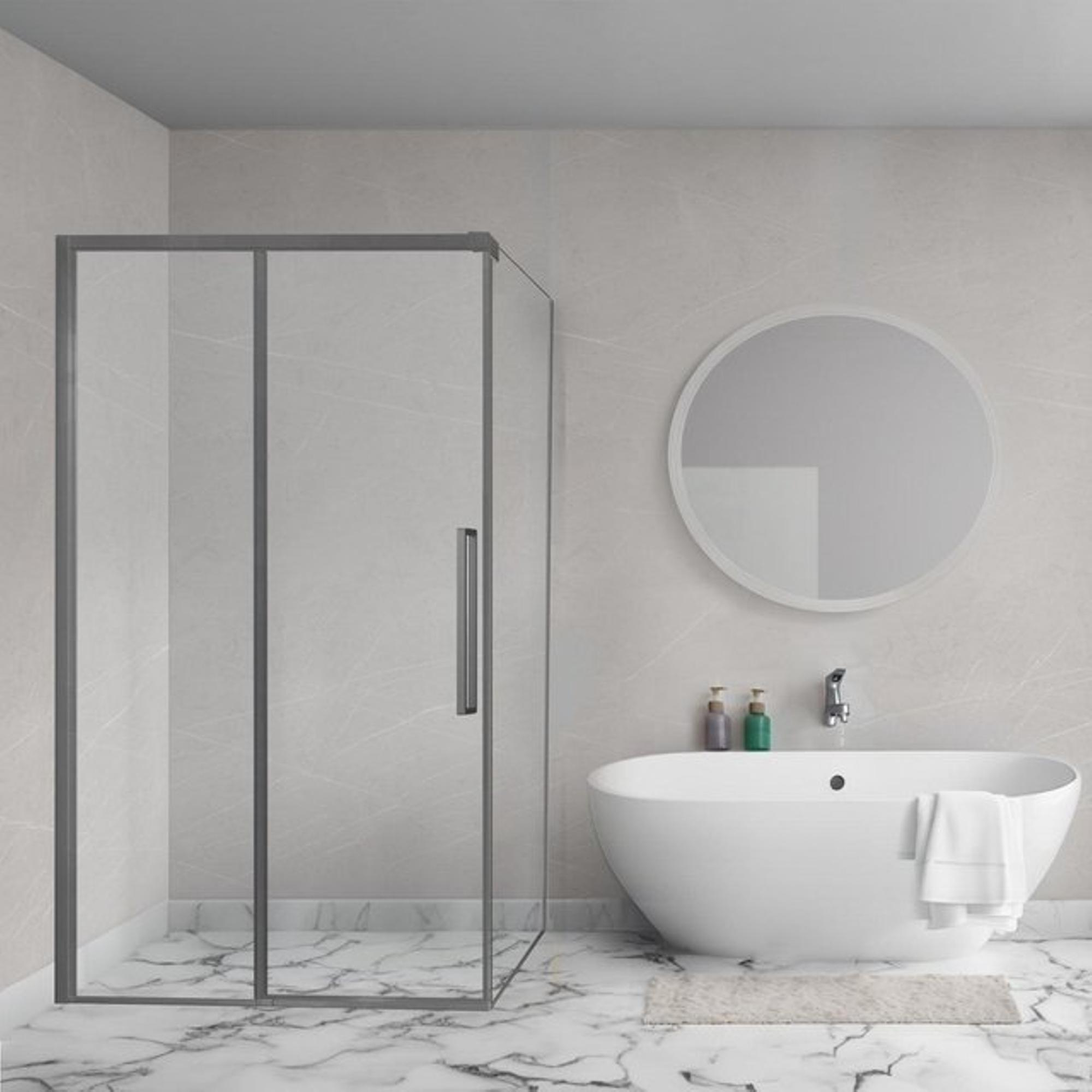 De gunmetal mat afgewerkte profielen geven de zijwand een luxe en moderne uitstraling die naadloos aansluit bij diverse badkamerstijlen. Het heldere veiligheidsglas zorgt voor een ruimtelijk effect, waardoor je badkamer groter en lichter oogt. Deze combinatie van materialen en kleuren maakt het een echte blikvanger, zonder dat het overheerst. Zo creëer je een stijlvolle en eigentijdse douchehoek die je elke dag opnieuw inspireert.