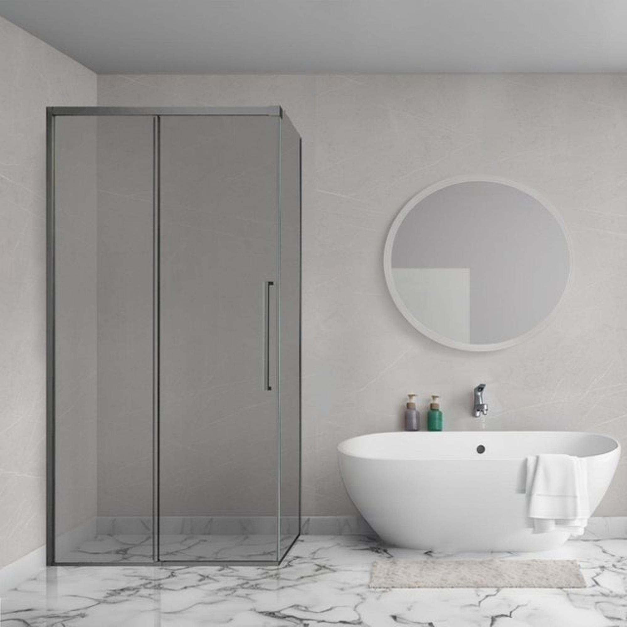 De combinatie van rookglas en gunmetal mat beslag geeft deze zijwand een unieke, moderne uitstraling. Het rookglas zorgt voor privacy zonder het licht te blokkeren, waardoor je badkamer ruimtelijk en licht blijft. De donkere, matte kleur van het beslag voegt een stoer accent toe dat perfect past bij eigentijdse en industriële interieurs. Zo creëer je een stijlvolle douchehoek die direct in het oog springt en je badkamer een exclusieve uitstraling geeft.