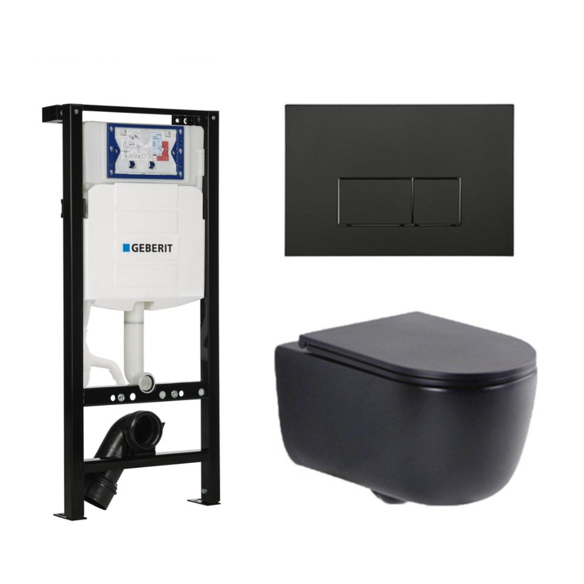 QeramiQ Dely Swirl Toiletset - 36.3x51.7cm - Inbouwreservoir met Geberit UP320 spoelmechanisme - slim zitting - mat zwarte metalen bedieningsplaat - rechthoekige knoppen - mat zwart
