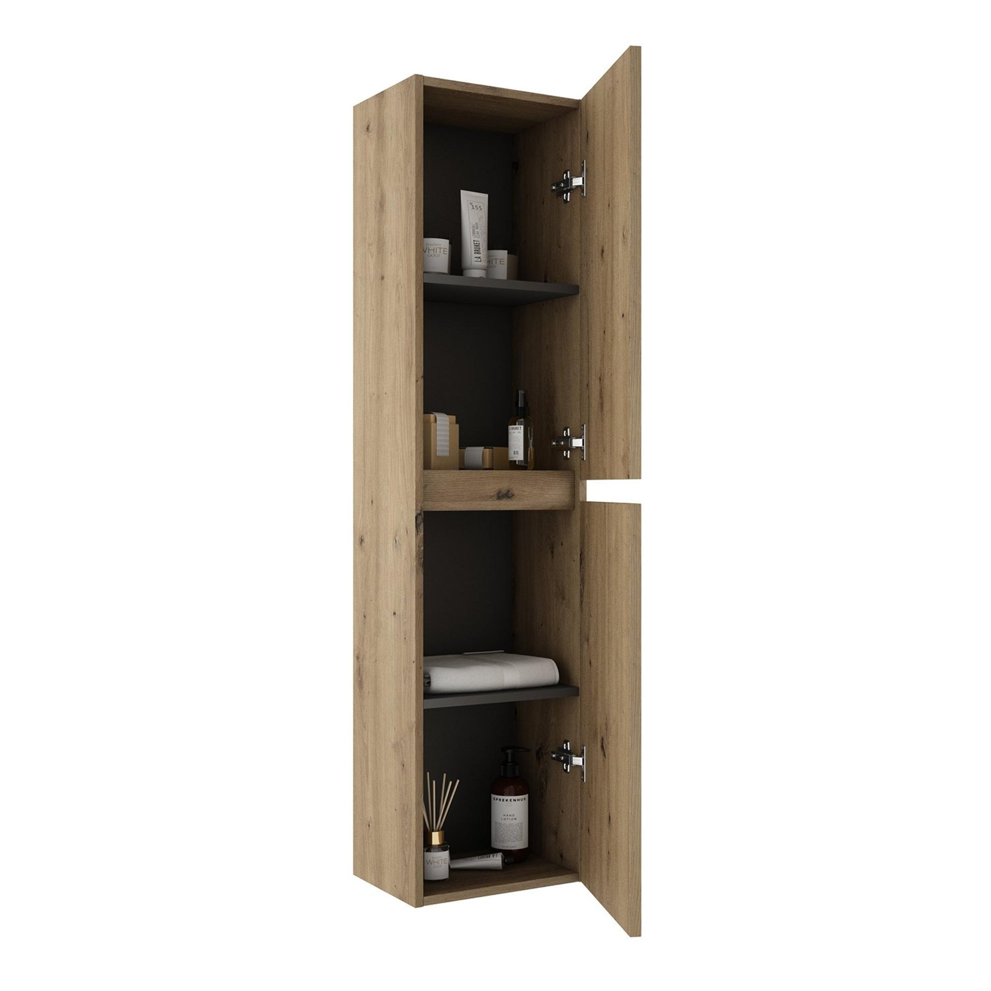 Deze hoge kast heeft twee deuren die een overzichtelijk interieur verbergen. Ideaal voor het netjes opbergen van handdoeken, toiletartikelen en andere badkamerbenodigdheden. De kast is ontworpen met aandacht voor zowel functionaliteit als esthetiek, zodat je badkamer er verzorgd en georganiseerd uitziet.