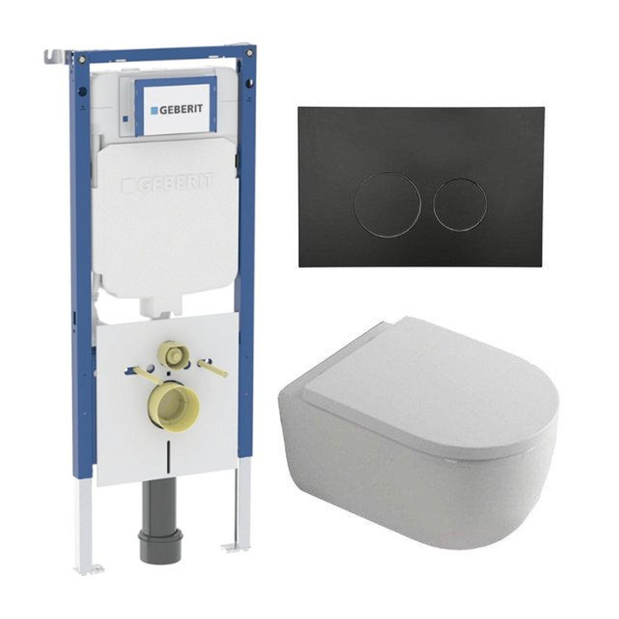 QeramiQ Dely Swirl Toiletset - 36.3x51.7cm - Geberit UP720 inbouwreservoir - 35mm zitting - mat zwarte bedieningsplaat - ronde knoppen - wit mat