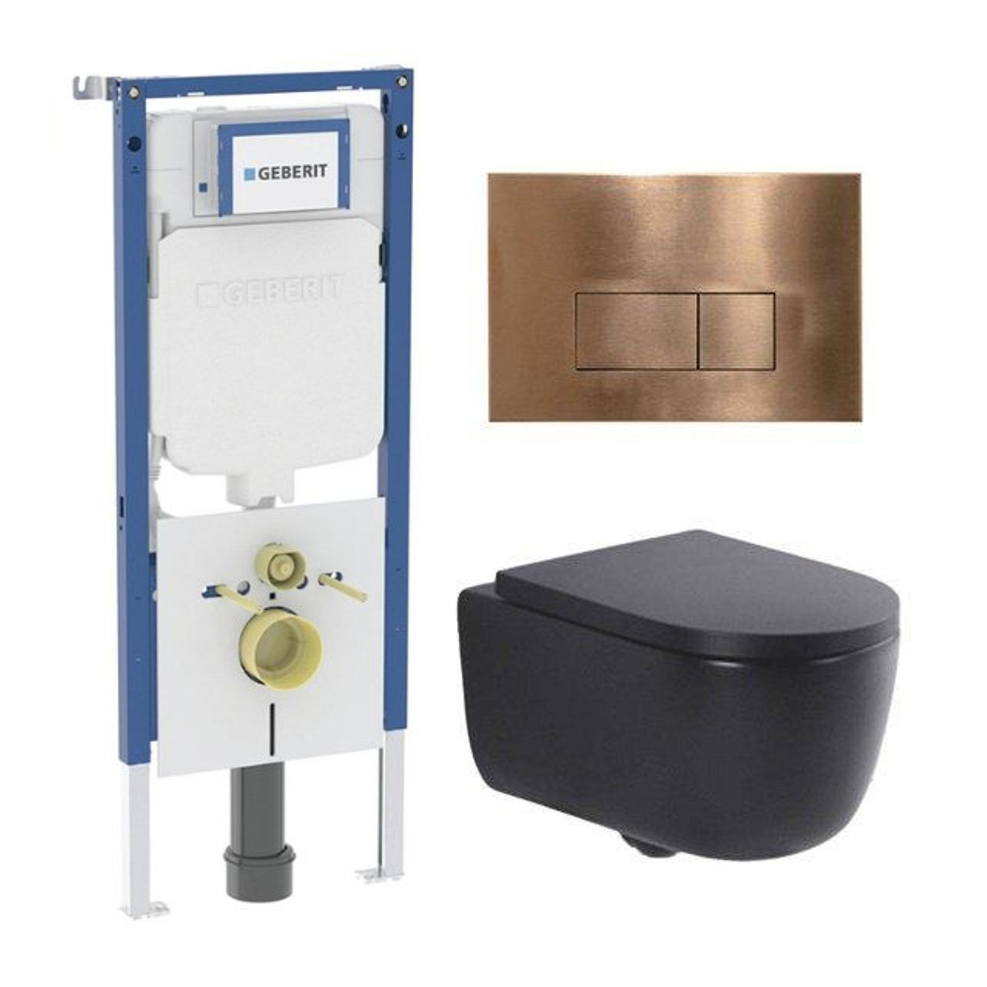 QeramiQ Dely Swirl Toiletset - 36.3x51.7cm - Geberit UP720 Duofix Sigma inbouwreservoir - 35mm zitting - koperen bedieningsplaat - rechthoekige knoppen - mat zwart