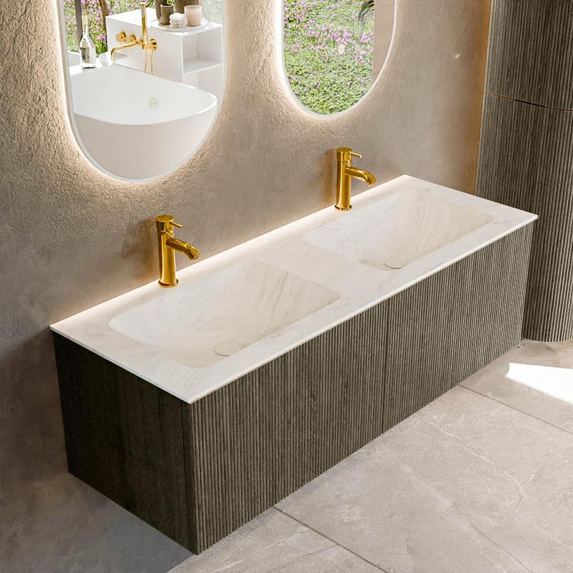 Mondiaz KURVE-DLUX Badkamermeubelset - 130x46x40cm - 2 lade - wastafel solid surface - dubbel - 2 kraangaten - Shadow