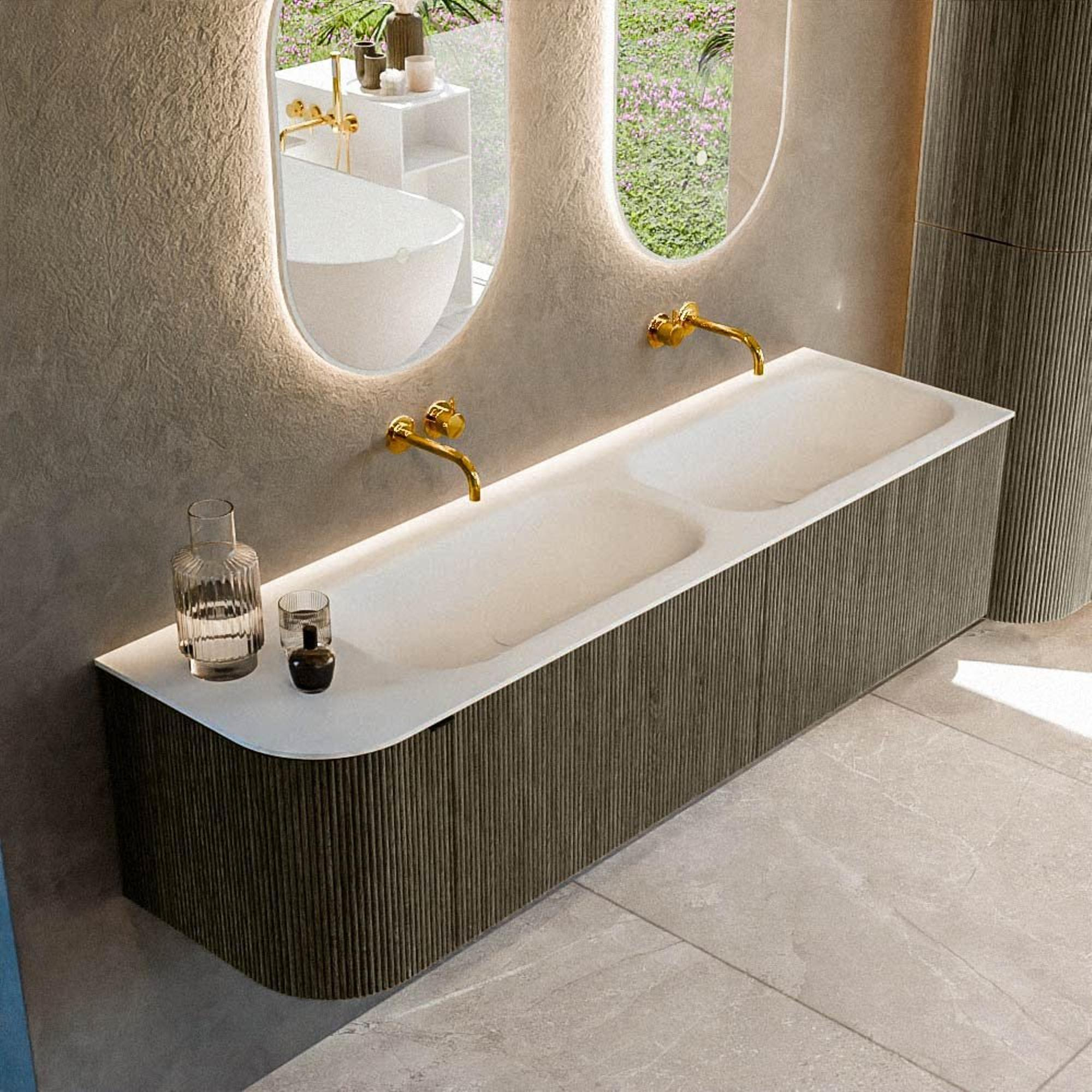 Stel je voor dat je de badkamer binnenloopt en je oog meteen valt op een elegant en stijlvol meubelstuk dat niet alleen perfect functioneert, maar ook een vleugje verfijning toevoegt aan de ruimte. Dit badkamermeubel straalt met zijn strakke, minimalistische ontwerp en de subtiele tint van Shadow, een ingetogen doch opvallende kleur die moeiteloos in elke badkameromgeving past. De afmetingen van 165x46x40cm maken het tot een veelzijdige keuze voor zowel ruime als compactere badkamers. De geïntegreerde laden en deur bieden praktische opbergruimte, waarmee je de badkamer netjes en georganiseerd houdt. De wastafel, vervaardigd van solid surface materiaal, is een lust voor het oog en nodigt uit tot aanraken door zijn gladde en naadloze afwerking. Deze dubbele wastafel, strategisch geplaatst aan de rechterkant, maakt het tegelijkertijd praktisch voor gebruik door meerdere personen. Ook al ontbreekt het traditionele kraangat, dit biedt je de vrijheid om jouw kraan volledig naar eigen smaak te positioneren, wat de flexibiliteit van dit meubel extra onderstreept. Door zijn moderne uitstraling en functionele ontwerp, is het een badkamermeubel dat ongetwijfeld een plezier is om elke dag weer te gebruiken.