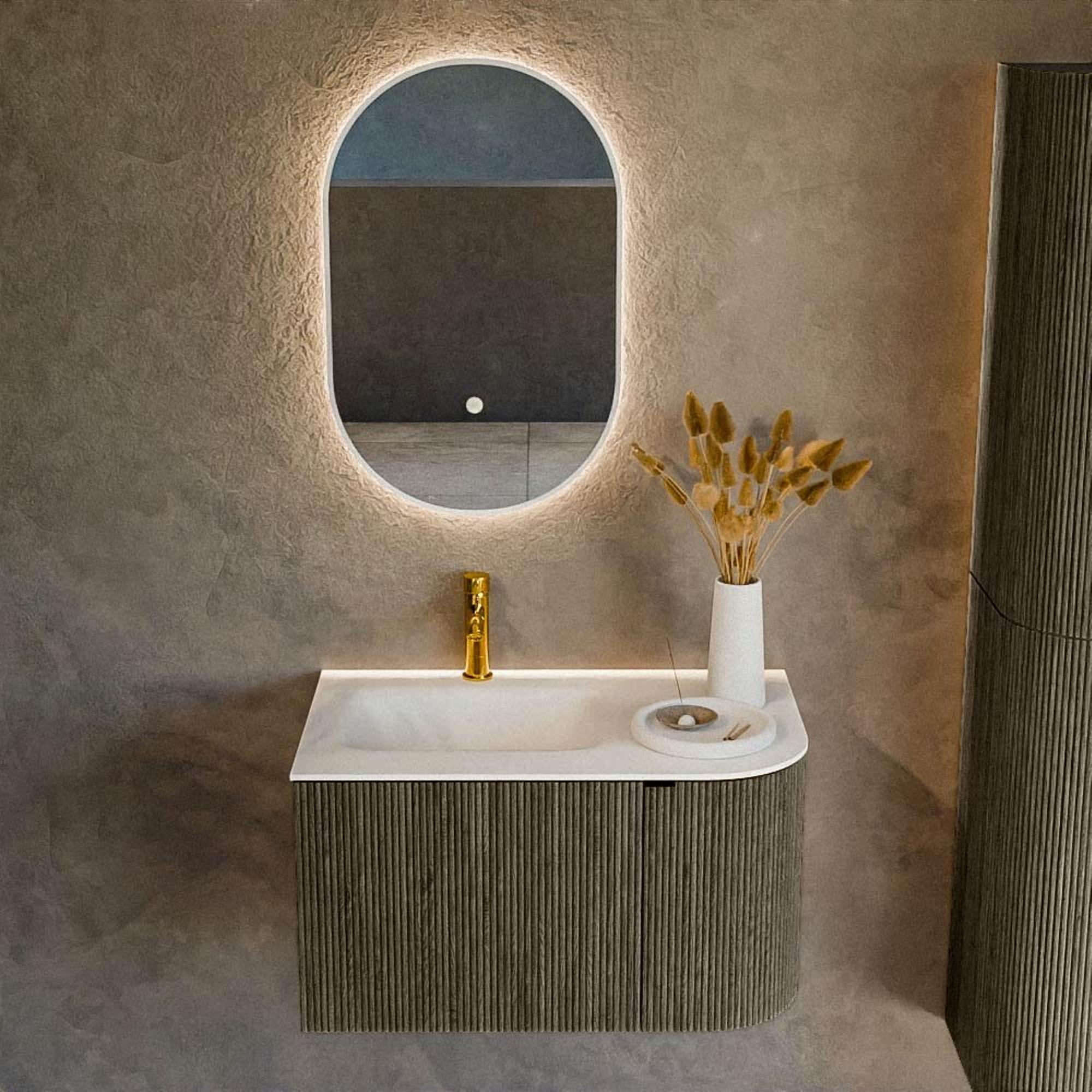 Stijlvol en functioneel tegelijk, deze prachtige badkamermeubelset brengt moderne elegantie in jouw persoonlijke verzorgingsruimte. Met zijn strakke en verfijnde ontwerp biedt deze meubelset niet alleen een visuele aantrekkingskracht, maar ook een praktische oplossing voor jouw dagelijkse behoeften. De subtiele afwerking en verfijnde details geven je badkamer een tijdloze sfeer die naadloos aansluit bij uiteenlopende interieurstijlen. De set heeft een royale afmeting die perfect de balans vindt tussen ruimtebesparing en functionaliteit. Ergonomisch ontworpen om zowel comfort als gebruiksgemak te bieden, maakt de set jouw ochtendroutine net dat beetje aangenamer. De ingebouwde wastafel, vervaardigd van hoogwaardig solid surface materiaal, straalt niet alleen klasse uit, maar ook duurzaamheid, zodat je nog jarenlang van je investering kunt genieten. Met een handige linkse plaatsing en een kraangat, is deze set ontworpen om zich aan te passen aan je unieke woonruimte. Of je nu een minimalistische esthetiek nastreeft of gewoon op zoek bent naar een meubelstuk dat functionaliteit en stijl verenigt, deze badkamermeubelset past zich moeiteloos aan jouw behoeften en voorkeuren aan. Kortom, de perfecte keuze voor wie zijn badkamer tot een oase van rust en stijl wil verheffen.