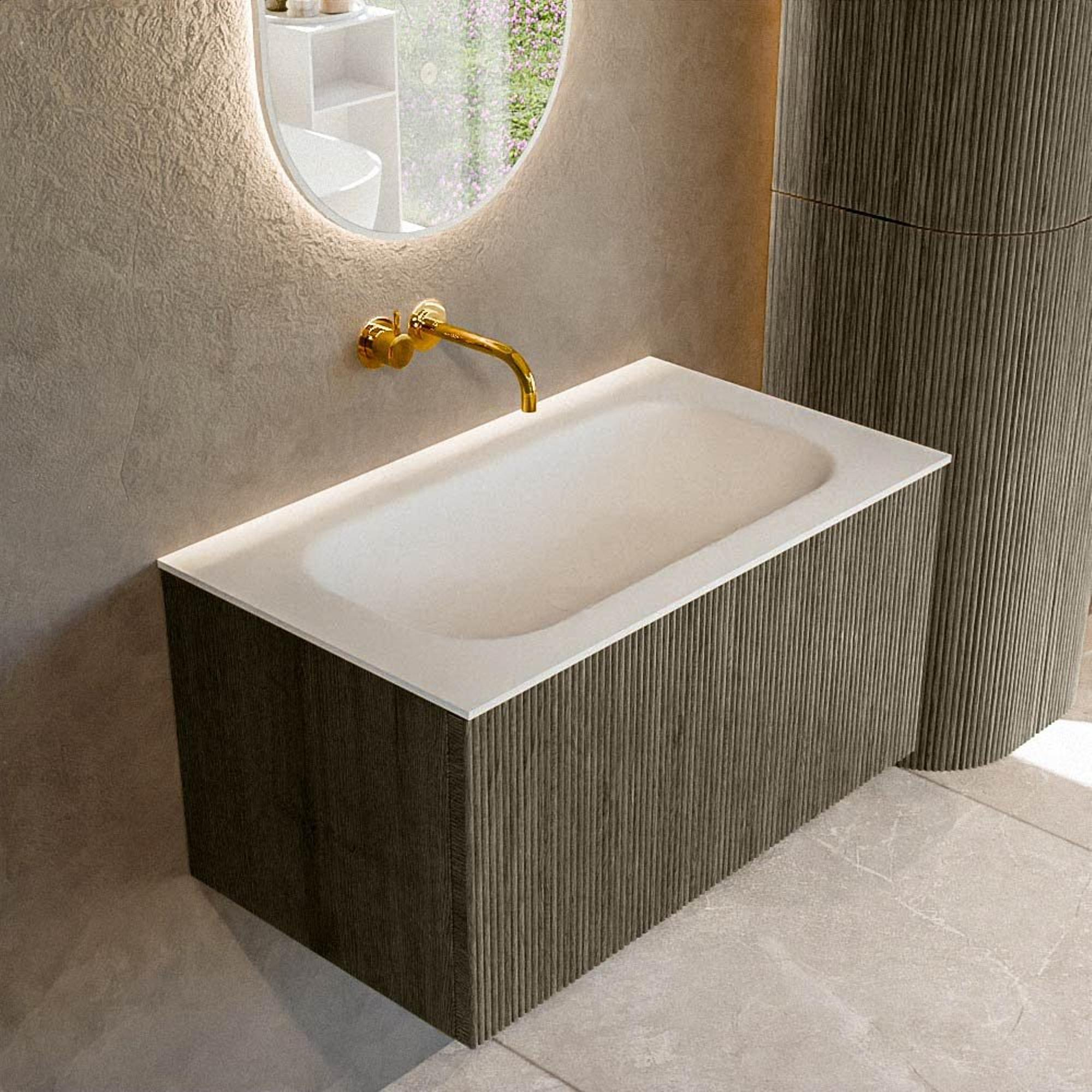 Functioneel Naast zijn indrukwekkende esthetiek is deze badkamermeubelset uiterst functioneel ontworpen. Met een breedte van 80 cm, een diepte van 46 cm en een hoogte van 40 cm, is het compact genoeg om in vrijwel elke ruimte te passen. Het biedt toch voldoende oppervlakte en opbergruimte. De ruime lade is ideaal om georganiseerde chaos tot een minimum te beperken, zodat je al je essentiële badkamerspullen netjes kunt opbergen. De wastafel, vervaardigd uit hoogwaardig solid surface, biedt niet alleen duurzaamheid maar ook praktische eigenschappen zoals een gemakkelijk te reinigen oppervlak. Het flexibele ontwerp, zonder kraangat, geeft je de vrijheid en mogelijkheid om een geschikte opbouwkraan te kiezen die je voorkeur heeft, wat bijdraagt aan de veelzijdigheid van de set en jouw persoonlijke inbreng in je badkamer herbergt. Deze combinatie van esthetiek en functionaliteit zorgt ervoor dat je zorgeloos kunt genieten van een georganiseerde en mooie ruimte die je dagelijks gebruik in de badkamer optimaliseert.