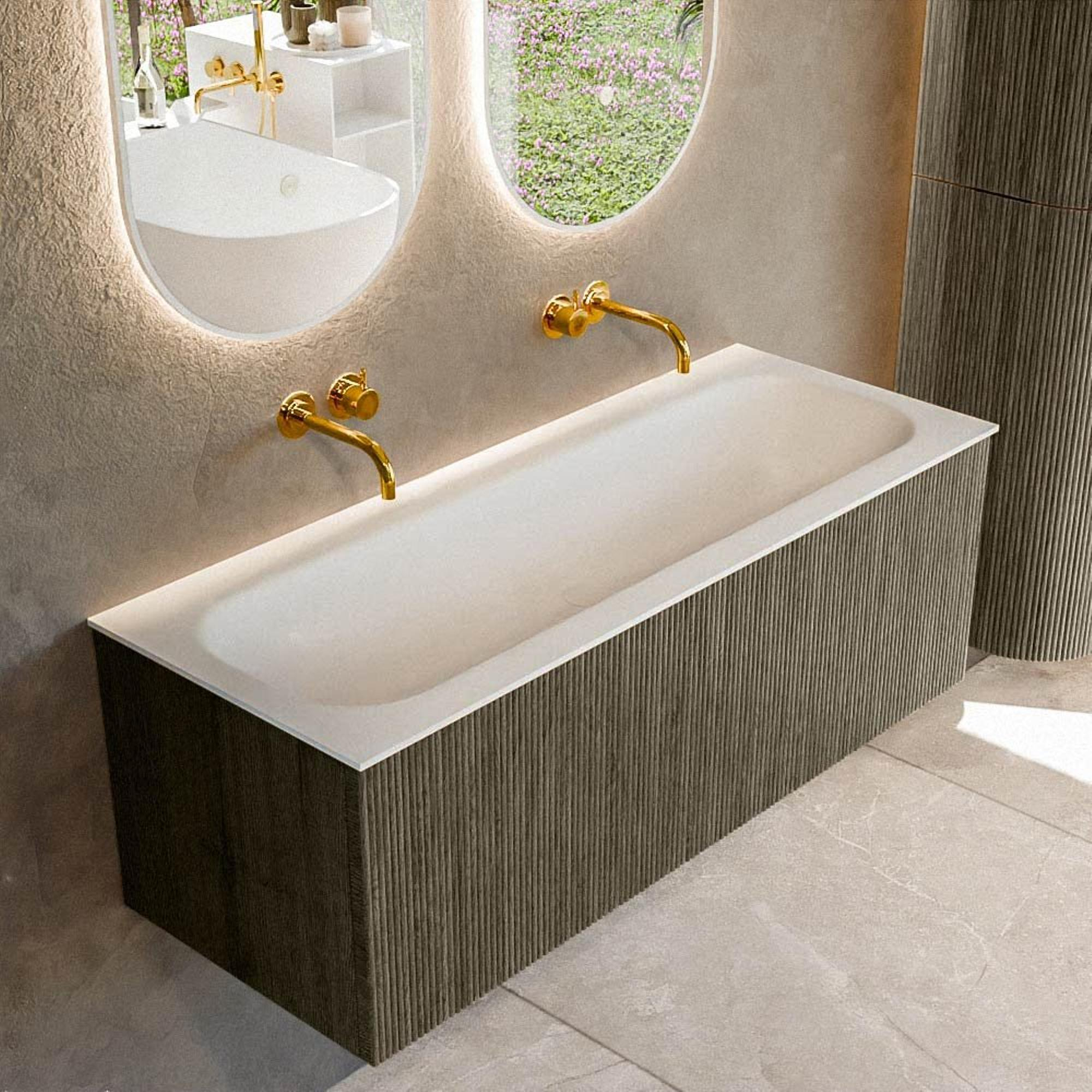 Laat jezelf betoveren door de Mondiaz KURVE Badkamermeubelset die een vleugje tijdloze elegantie toevoegt aan jouw badkameromgeving. Deze zorgvuldig ontworpen meubelset, met zijn gestroomlijnde afmetingen van 120x46x40 cm, biedt een verfijnde balans tussen functionaliteit en esthetiek. De enkelvoudige lade zorgt niet alleen voor een strakke uitstraling, maar biedt ook voldoende ruimte om jouw badkamerbenodigdheden netjes in op te bergen. Het is een perfecte oplossing voor iedereen die houdt van een opgeruimde en georganiseerde ruimte. De wastafel, vervaardigd uit solid surface materiaal, spreekt met zijn naadloze afwerking en zijn centrale positionering een minimalistische taal. Shadow, de kleur van deze set, brengt een mysterieuze en moderne toets in jouw badkamer en verzekert je van een look die zowel subtiel als indrukwekkend is. Je interieur krijgt een eigentijdse en stijlvolle uitstraling zonder in te boeten aan kwaliteit of functionaliteit. Met een ontwerp zonder kraangat wordt jouw creativiteit ook niet beperkt: je hebt de vrijheid om een kraan naar keuze te matchen aan jouw persoonlijke stijl, wat een extra laag van maatwerk en verfijning aan jouw badkamer toevoegt.
