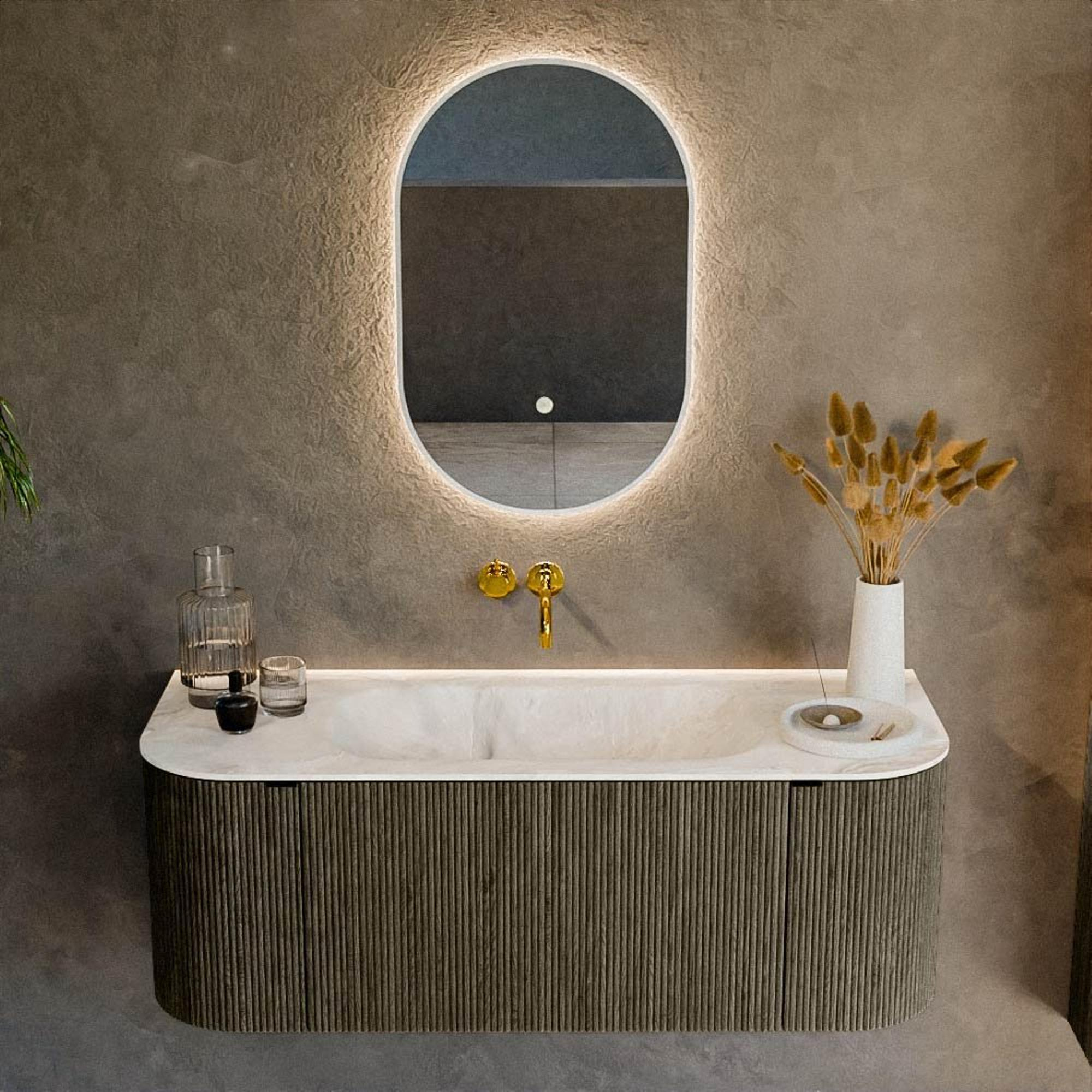 Elegant De elegante uitstraling van de badkamermeubelset is een van zijn meest onderscheidende kenmerken. Elk aspect van het ontwerp straalt verfijning uit; van de zorgvuldig afgeronde hoeken tot de symmetrische lijnen die bijdragen aan een harmonieuze look. De 'Shadow' tint voegt een moderne twist toe, die zeer goed combineert met zowel lichte als donkere kleurenschema's in de badkamer. Deze kleur zorgt voor een subtiel contrast en geeft zelfs de kleinste badkamers een ruimtelijk gevoel, zonder overweldigend te zijn. Het gebruik van solid surface als materiaal voor de wastafel benadrukt de elegante charme die dit meubelstuk aan elke ruimte geeft. Deze elegante kenmerken maken het tot meer dan alleen een functioneel element; het wordt een centraal stuk dat de stijl van je hele badkamer kan bepalen. Je zult merken dat de set niet alleen qua uiterlijk indruk maakt, maar ook qua duurzaamheid en kwaliteit, wat de elegante investering op de lange termijn rechtvaardigt. De Mondiaz KURVE-DLUX weerspiegelt een verfijnde smaak en esthetisch bewustzijn, iets dat elke ochtendroutine een beetje extra flair en luxe geeft.