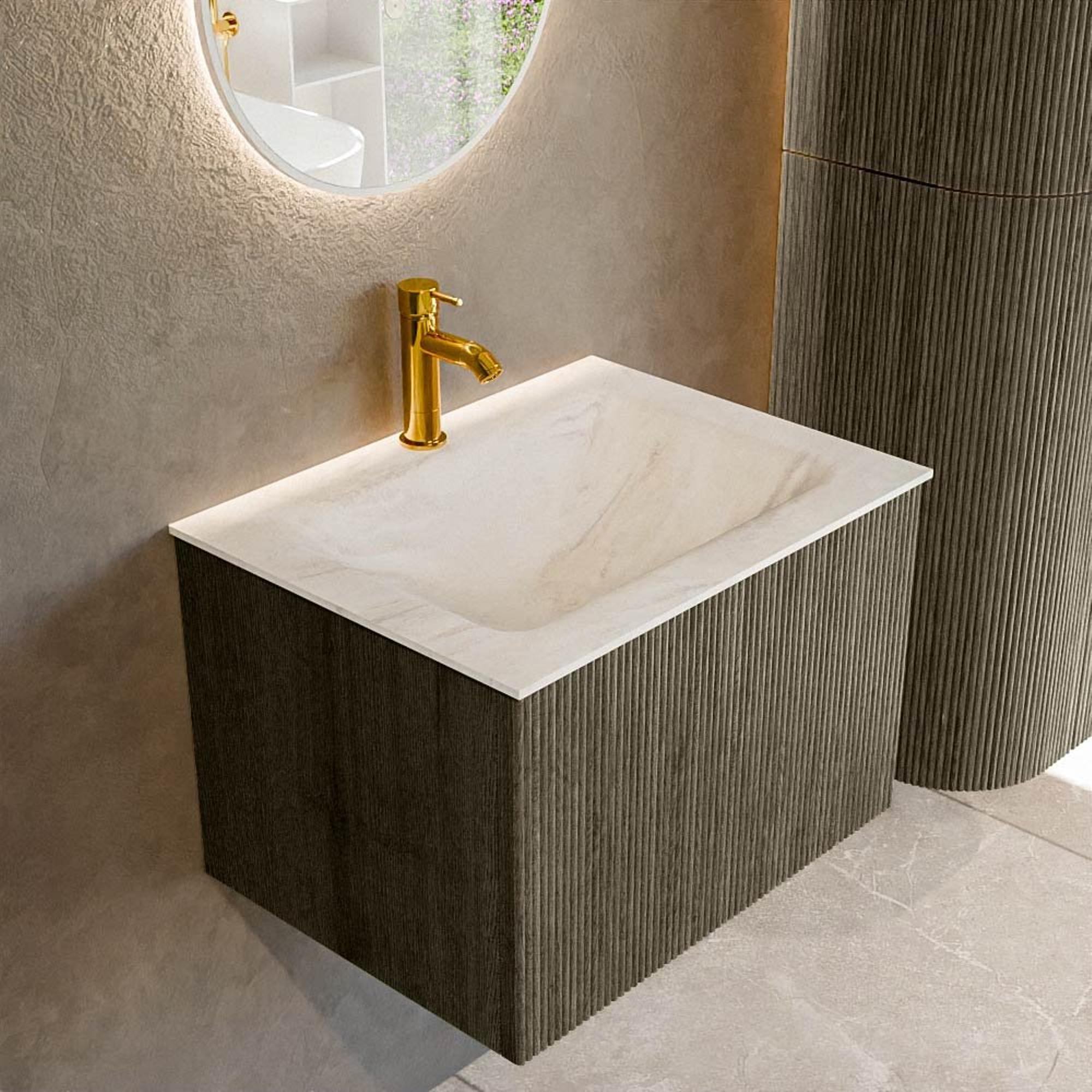 Functioneel Dit badkamermeubel is niet alleen een lust voor het oog, maar ook uiterst functioneel. De ruime lade biedt voldoende opbergruimte voor al je badkamerbenodigdheden, van handdoeken en verzorgingsproducten tot kleinere accessoires. Dankzij het slimme ontwerp kun je alles netjes geordend en binnen handbereik houden, wat ideaal is voor drukke ochtenden. Het solid surface materiaal van de wastafel is niet alleen mooi, maar ook zeer duurzaam en eenvoudig te reinigen, wat zorgt voor een lange levensduur en minimale onderhoudsvereisten. De strategische plaatsing van het enkele kraangat in het midden zorgt voor een optimale waterstraal en maakt het eenvoudig om te kiezen voor een kraanontwerp dat bij jouw stijl past. Het compact formaat van dit meubel maakt het ideaal voor kleinere badkamers of als aanvulling in een grotere ruimte. Door deze functionaliteiten kun je zonder zorgen genieten van een opgeruimde en georganiseerde badkamer, zonder concessies te doen aan stijl. Het badkamermeubel is ontworpen om jouw leven eenvoudiger te maken, met aandacht voor detail en gebruiksgemak, die je dagelijks zult waarderen.