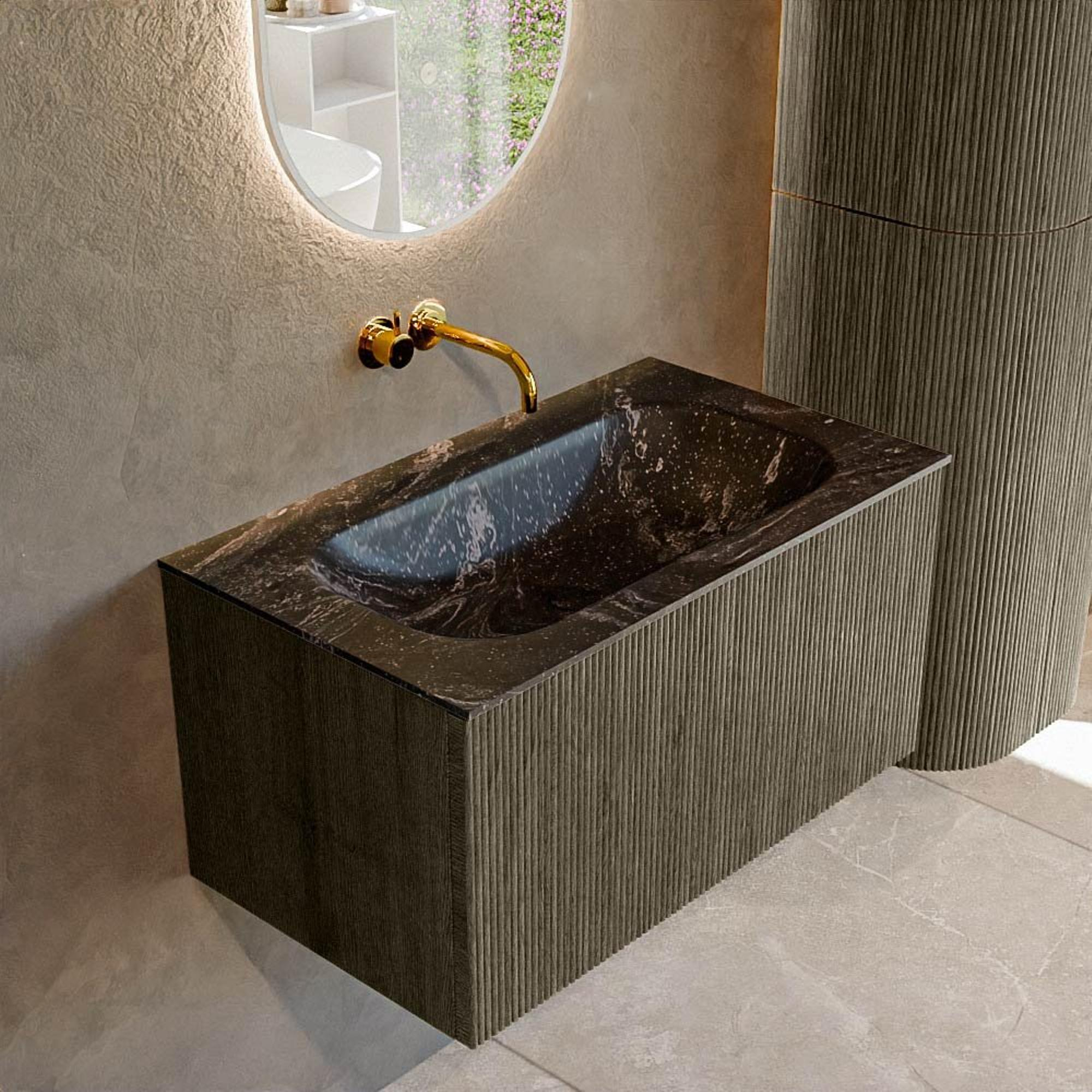 Stijlvol De stijlvolle uitstraling van dit badkamermeubel geeft jouw badkamer een eigentijdse touch zonder dat het te overheersend wordt. Elk element van het ontwerp is erop gericht om vorm en functie op een naadloze manier te combineren. De 'Shadow' afwerking voegt diepte toe aan je badkamerinterieur, waardoor het in elke lichtinval prachtig tot zijn recht komt. Het ontwerp met één lade zorgt voor een opgeruimde en geordende ruimte. Deze lade combineert functionaliteit met elegantie en biedt voldoende ruimte voor al jouw cosmetica en verzorgingsproducten zodat je badkamer altijd opgeruimd en netjes oogt. Verdere elementen van de set, zoals de gladde afwerking van de solid surface wastafel, verzekeren een gemakkelijk te onderhouden en hygiënische omgeving. Dit badkamermeubel weerspiegelt een aandacht voor detail en biedt ruimte voor individualiteit in de kleinste details, zoals het ontbreken van een kraangat. Dit laatste geeft je de creatieve vrijheid om een bijpassende kraan te kiezen die jouw persoonlijke stijl volledig weerspiegelt, waardoor jouw badkamer uniek en stijlvol blijft. Je zult merken hoe de hedendaagse esthetiek en praktische inrichting van deze badkamermeubelset een nieuwe standaard zet voor jouw dagelijkse badkamerervaring.
