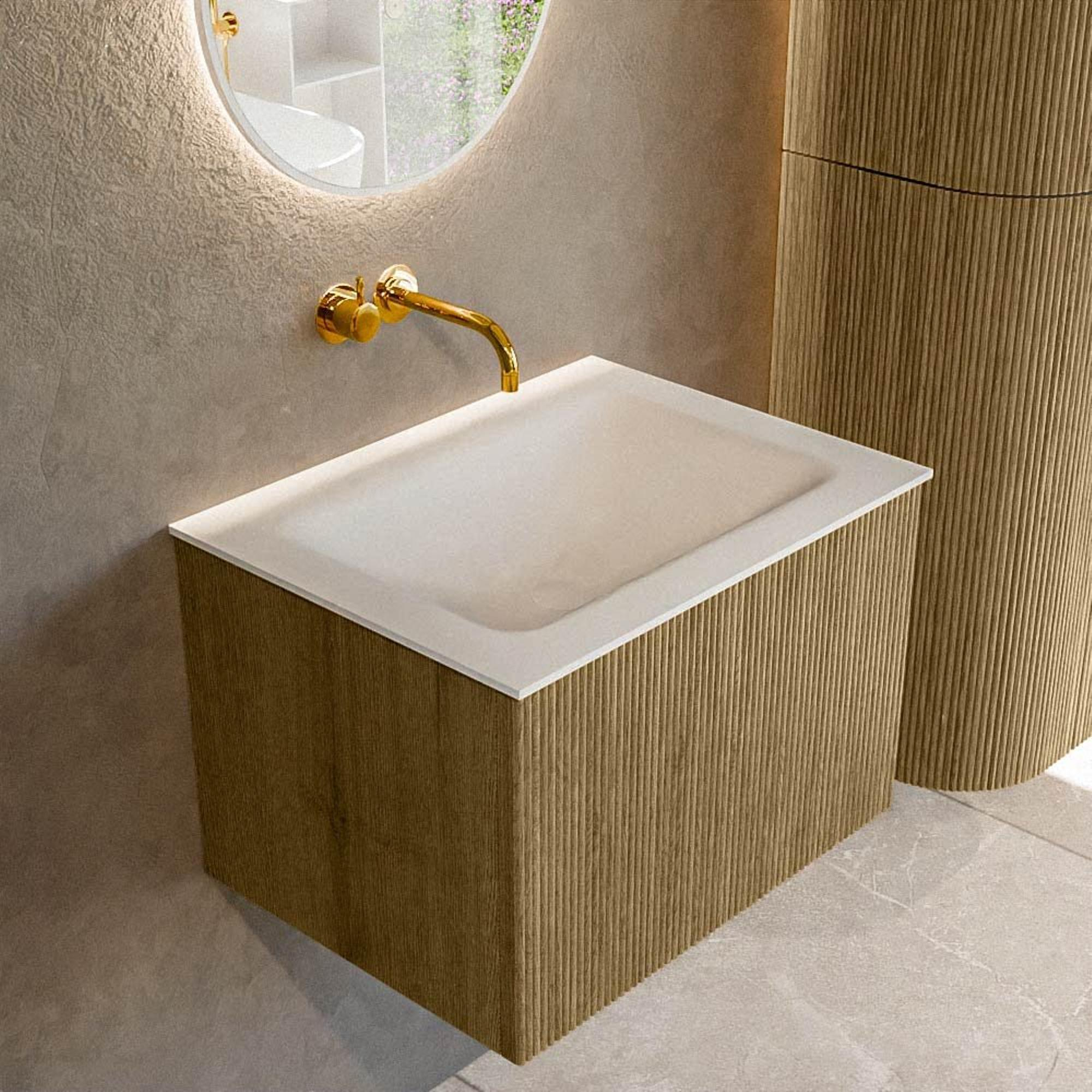 Functioneel Deze set is ontworpen met een scherp oog voor functionaliteit, zodat het dagelijkse gebruik moeiteloos en aangenaam is. De ruime lade biedt gemakkelijke toegang tot al je producten, van handdoeken tot cosmetica, en helpt je om je badkamer georganiseerd te houden. De slijtvastheid van het solid surface materiaal van de wastafel verzekert dat het meubel de intensiteit van dagelijks gebruik moeiteloos kan weerstaan, zonder in te boeten op kwaliteit of uitstraling. Het ontbreken van een kraangat betekent dat je flexibel kunt zijn in jouw keuze van sanitair accessoires, waardoor een wateruitloop kan worden gekozen die perfect bij jouw persoonlijke stijl past. Dit meubel is de belichaming van praktische schoonheid, waar vorm en functie harmonieus samenkomen in jouw badkameromgeving.