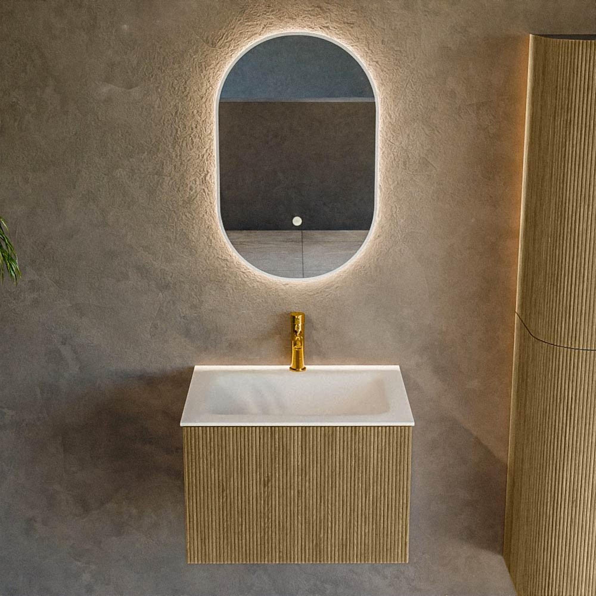 Functioneel Praktisch ontwerp en doordachte functionaliteit maken deze meubelset tot een onmisbare aanvulling in elke badkamer. Met één handige lade biedt het voldoende opbergruimte, zodat al je essentiële badkamerartikelen netjes georganiseerd en gemakkelijk bereikbaar zijn. Deze lade is ontworpen om soepel te glijden, waardoor je gemakkelijk toegang hebt tot alles wat je nodig hebt, terwijl de opbergruimte ruim genoeg is om al je belangrijke items een plaats te geven zonder dat het er rommelig uitziet. Het een kraangat in het midden van de wastafel maakt de installatie en het dagelijks gebruik een eenvoudige ervaring. De solid surface wastafel is duurzaam, krasbestendig en onderhoudsarm, wat betekent dat je meer tijd hebt om te genieten van je badkamer en minder tijd kwijt bent aan schoonmaken. De functionaliteit wordt verder geaccentueerd door het ontwerp dat de ruimte optimaal benut, zonder daarbij in te boeten aan esthetiek of comfort.
