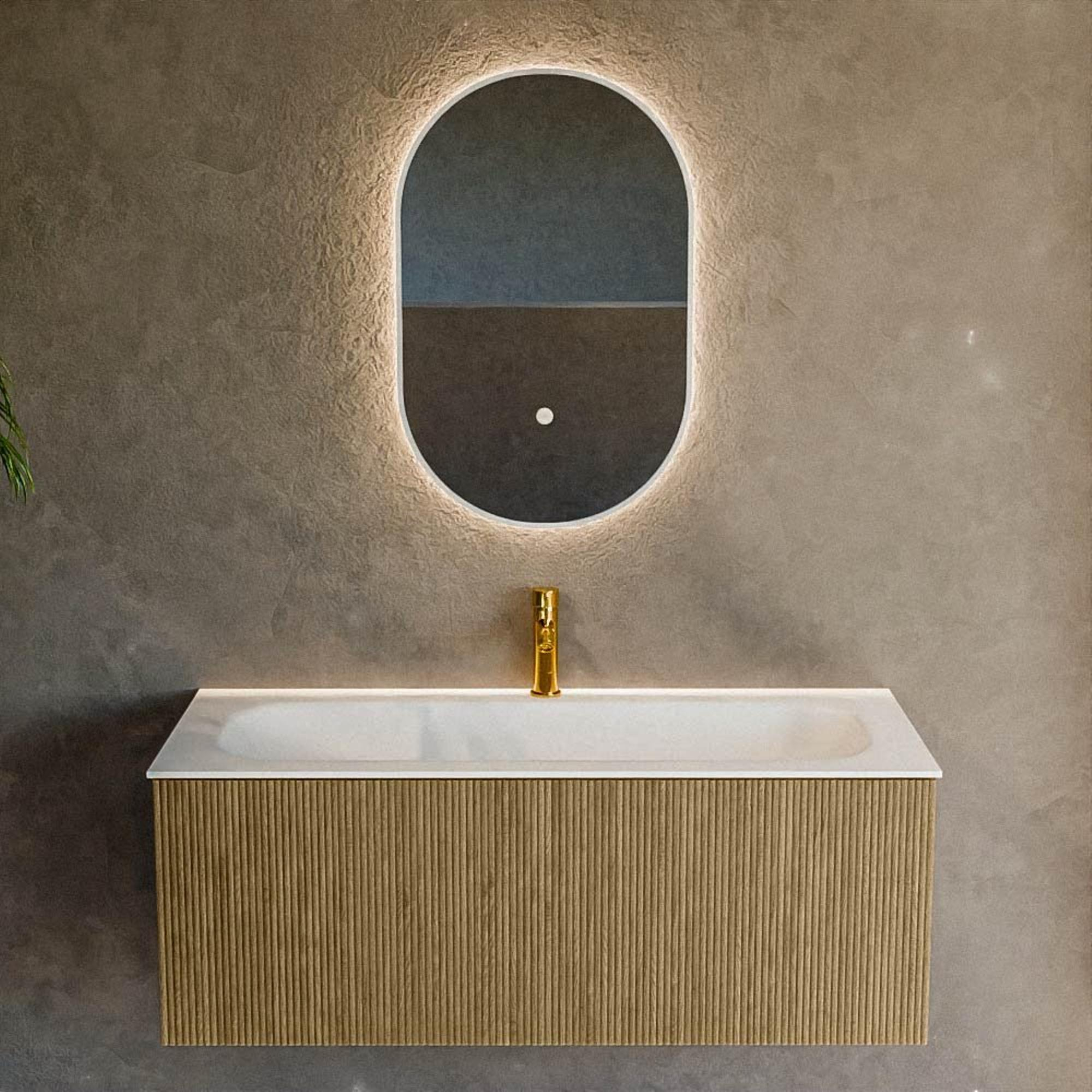 Functioneel Deze meubelset is niet alleen een lust voor het oog, maar biedt ook praktische oplossingen voor jouw badkamerbehoeften. De ruim bemeten lade biedt volop ruimte voor al je essentiële toiletartikelen, zodat je alles georganiseerd en binnen handbereik kunt houden. Dankzij het innovatieve ontwerp van de lade kun je de ruimte optimaal benutten, wat bijdraagt aan een opgeruimde en serene badkameromgeving. De solid surface wastafel biedt een duurzaam en hygiënisch oppervlak dat eenvoudig schoon te houden is. Het enkelvoudige kraangat is strategisch geplaatst om spetters te minimaliseren en het geheel esthetisch strak te houden. Met deze set realiseer je moeiteloos een georganiseerde, functionele badkameromgeving die voorzien is van alle gemakken.