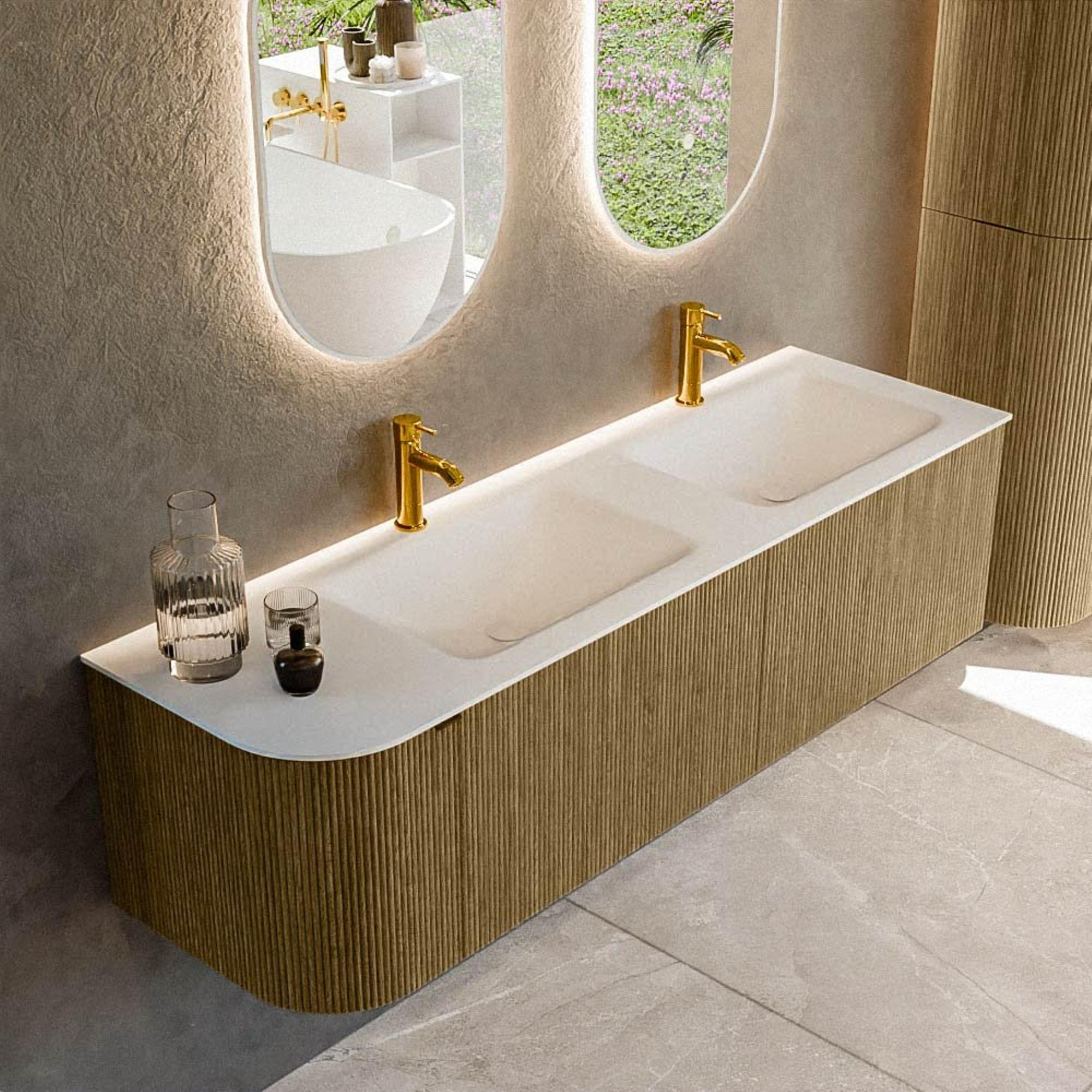 Functioneel Naast zijn esthetische veelzijdigheid, biedt deze badkamermeubelset een uitstekende functionele waarde. De royale afmetingen en praktische indeling met twee ruime laden en een handige deur zorgen ervoor dat al jouw spullen netjes opgeborgen zijn en gemakkelijk toegankelijk blijven. Dit opberggemak maakt het een ideale oplossing voor drukke ochtenden, waarin efficiëntie en orde van het grootste belang zijn. De wastafel, vervaardigd uit solid surface, biedt niet alleen een royale wasruimte, maar is ook kras- en vlekbestendig, waardoor hij bestand is tegen de eisen van dagelijks gebruik. Dit maakt hem perfect voor gezinnen die een duurzame en onderhoudsarme oplossing wensen. Bovendien bieden de dubbele kraangaten extra flexibiliteit, ideaal voor koppels of gezinnen die samen een badkamer delen. Zo combineert deze set niet alleen verfijnde designkenmerken maar ook doordachte bruikbaarheid om aan jouw persoonlijke en gezinsbehoeften te voldoen.