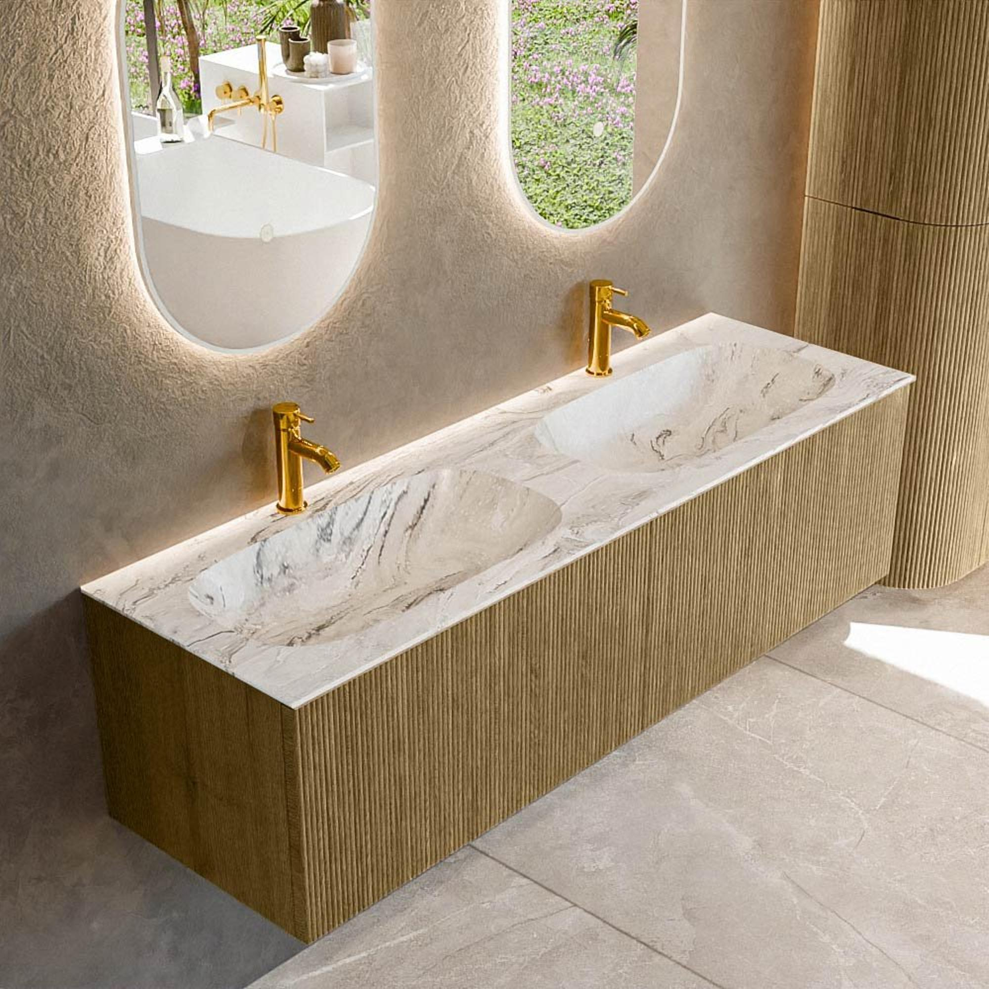 Mondiaz KURVE-DLUX Badkamermeubelset - 150x46x40cm - 2 lade - wastafel solid surface - dubbel - 2 kraangaten - Dusk