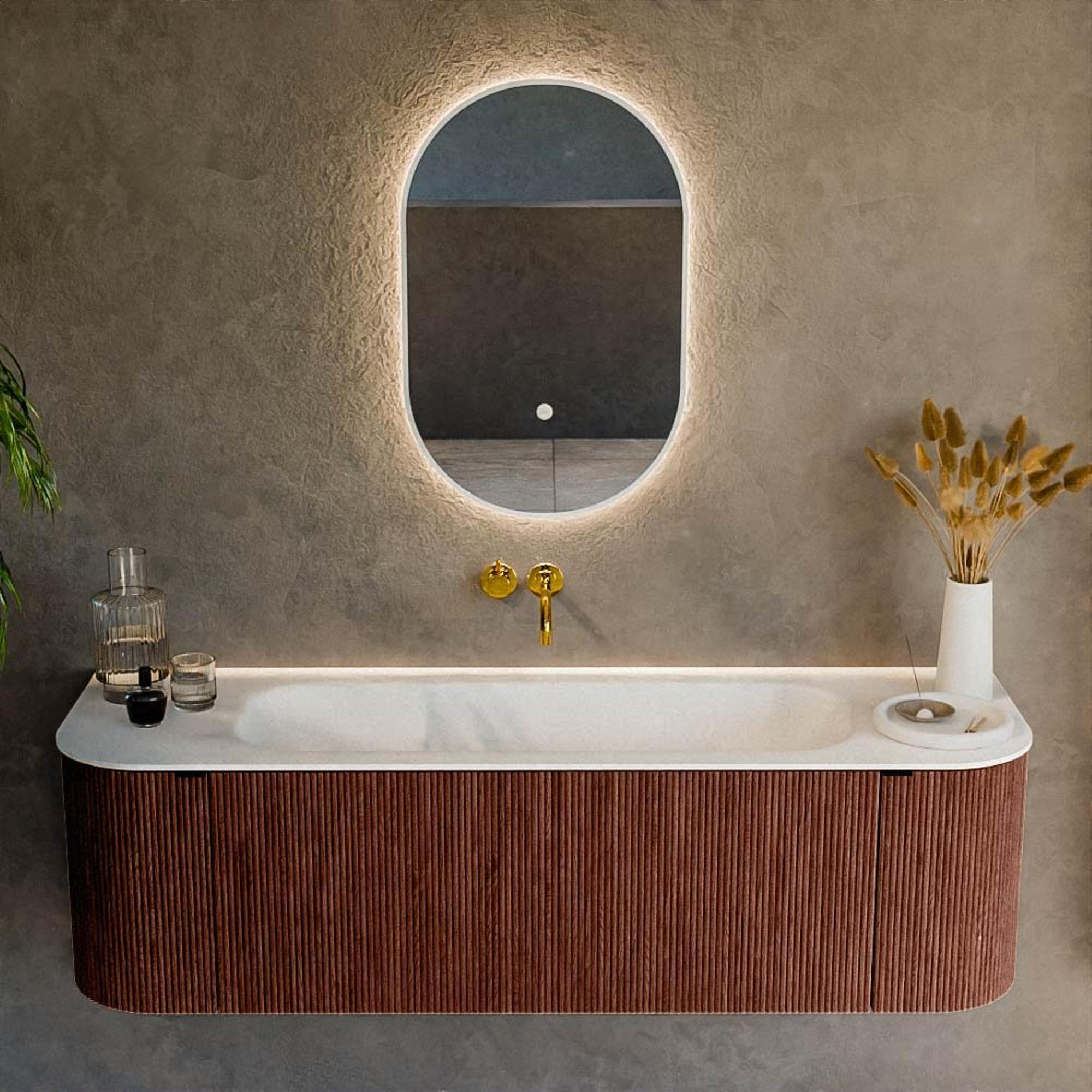 De Mondiaz KURVE badkamermeubelset biedt een harmonieus samenspel van esthetiek en functionaliteit, ontworpen om je badkamer te transformeren in een serene en stijlvolle ruimte. Met zijn indrukwekkende afmetingen van 150x46x40 cm strekt deze meubelset zich uit in elke badkamer, waardoor er een gevoel van ruimtelijkheid wordt gecreëerd zonder de kamer te overweldigen. De combinatie van één lade en twee deuren biedt voldoende opbergruimte, waardoor je de chaos gemakkelijk op afstand kunt houden en een georganiseerde en serene omgeving kunt behouden. Het solid surface wastafelblad, strategisch gepositioneerd in het midden, zorgt voor een evenwichtige en symmetrische uitstraling die de moderne badkamerliefhebber zeker zal aanspreken. Door het ontbreken van een kraangat wordt een strak en minimalistisch design behouden, zodat je de flexibiliteit hebt om een opbouwkraan te selecteren die het beste bij je unieke stijl past. De rijke Ruby-kleur geeft een vleugje luxe en verfijning aan elke badkamer, waardoor deze meubelset niet zomaar een praktisch element is, maar een statement-piece dat de toon zet voor je hele interieur.