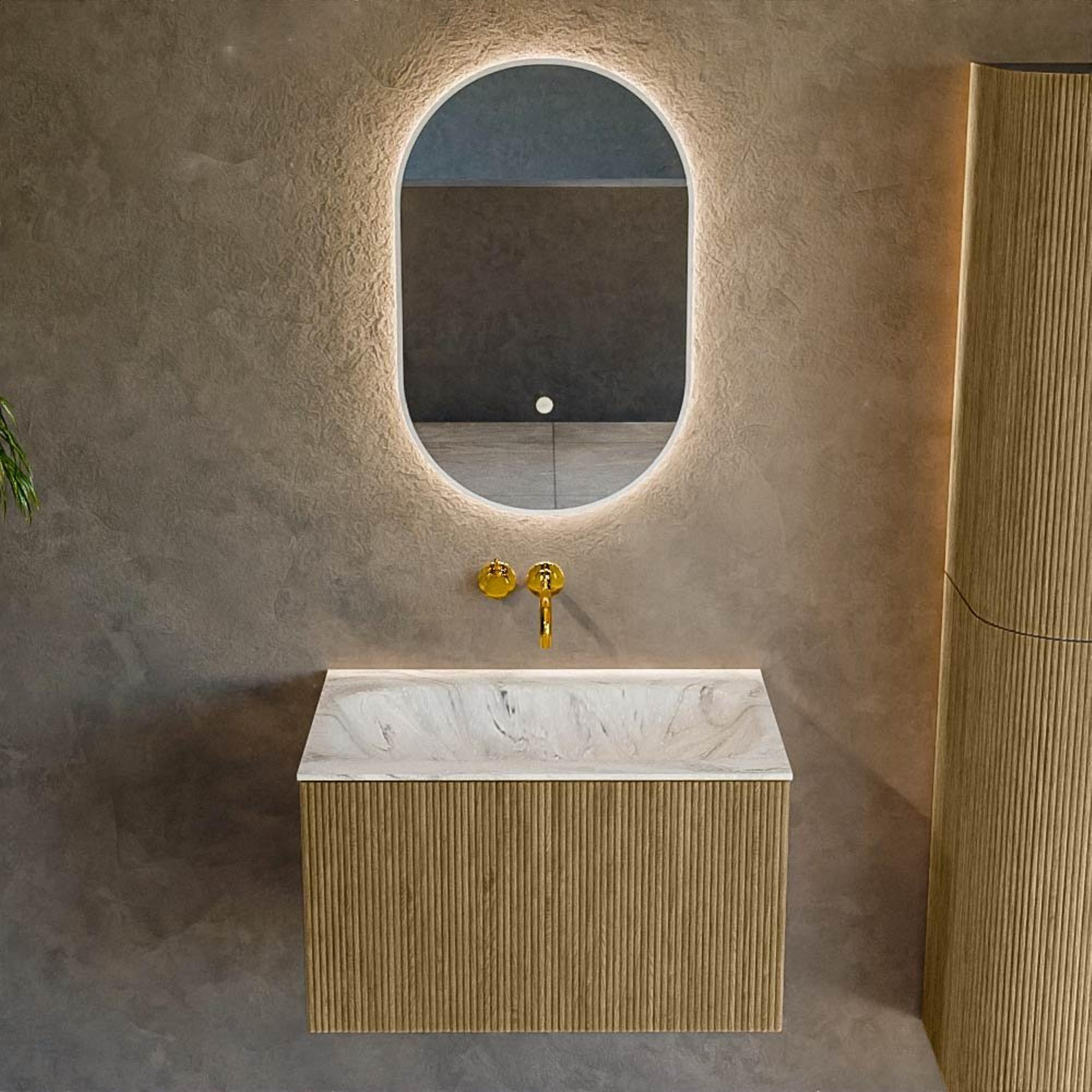 Ervaar de perfecte combinatie van stijl en functionaliteit met deze elegante badkamermeubelset. Met zijn doordachte afmetingen en het moderne ontwerp is het de ideale aanvulling voor iedere badkamer, groot of klein. Deze set weet een verfijnde uitstraling te combineren met praktische functionaliteit, waardoor de ruimte niet alleen mooier wordt, maar ook efficiënter in gebruik. De strakke lijnen en het verfijnde contrast van materialen stralen luxe uit en geven jouw badkamer een eigentijdse en uitnodigende sfeer. Doordat het meubel is uitgevoerd met één lade, biedt het voldoende opbergruimte voor al je essentials, terwijl het minimalistische ontwerp ervoor zorgt dat de badkamer een rustige uitstraling behoudt. De geïntegreerde wastafel van solid surface heeft een prachtig middenontwerp waarmee elke dagelijkse routine net dat beetje extra krijgt. Dit meubel is ontworpen zonder kraangat, wat een strakke en opgeruimde look geeft, en jou de vrijheid biedt om de keuze te maken voor jouw eigen favoriete kraaninstallatie die bij jouw stijl past. Zo wordt je badkamer een plek waar functionaliteit en esthetiek elkaar ontmoeten, en je elke dag met plezier begint of afsluit.