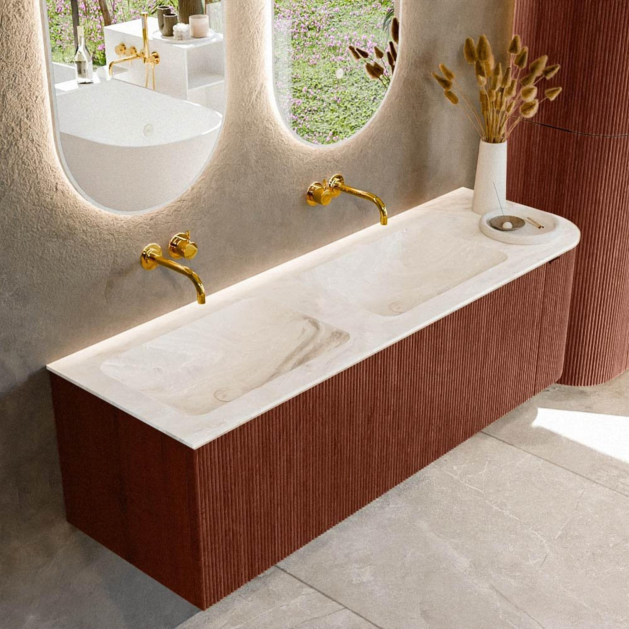 Mondiaz KURVE-DLUX Badkamermeubelset - 145x46x40cm - 1 lade - 1 deur - wastafel solid surface - dubbel / links - zonder kraangat - Ruby