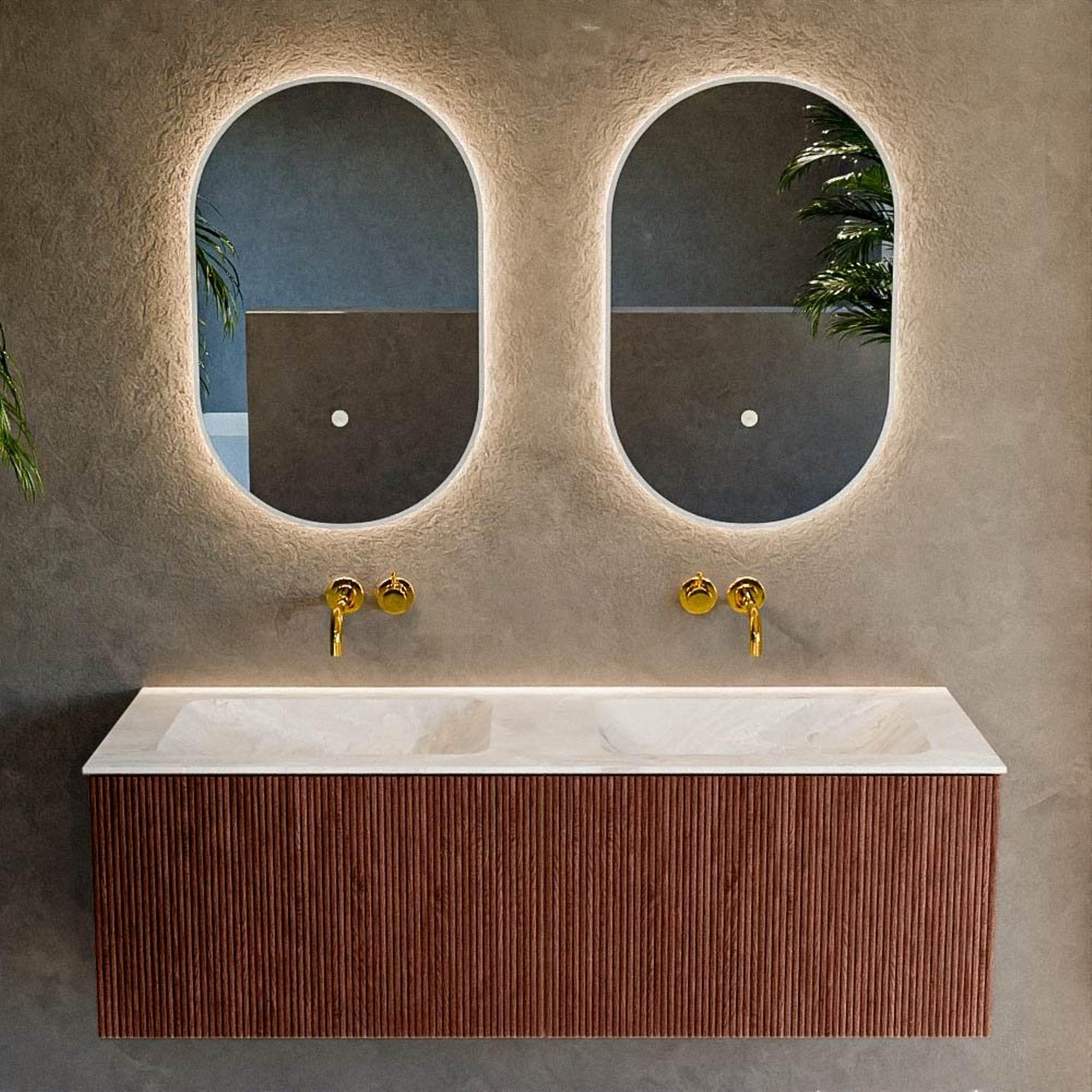 Ontmoet jouw nieuwe badkamerfavoriet! Deze uitstekende badkamermeubelset brengt een subtiele mix van functionaliteit en esthetiek naar jouw persoonlijke oase van rust. Het elegante ontwerp trekt direct de aandacht en verandert jouw badkamer in een stijlvolle ruimte. Gekenmerkt door zijn strakke lijnen en moderne uitstraling, is deze set een ware blikvanger die perfect past in zowel klassieke als moderne interieurs. De luxueuze dubbele wastafel in solid surface biedt voldoende ruimte voor al jouw dagelijkse rituelen, terwijl de prachtige afwerking in een unieke Ruby-kleur een vleugje kleur en persoonlijke flair toevoegt aan de ruimte. De zorgvuldig ontworpen laden zorgen voor volop opbergruimte, zodat je badkamer altijd opgeruimd en georganiseerd blijft. Met zijn subtiele schoonheid en ongeëvenaarde bruikbaarheid is deze set niet zomaar een meubelstuk, maar een ervaring die je zintuigen prikkelt.