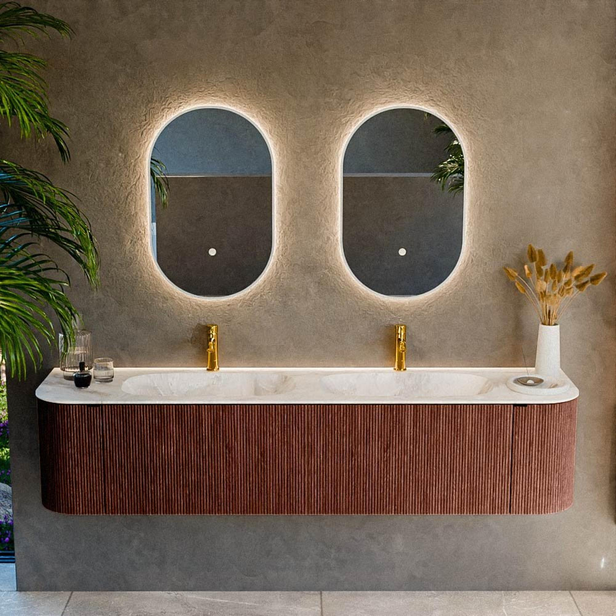 Stel je voor dat je badkamer een oase van rust en stijl is, waarin elk element zorgvuldig is samengesteld om zowel functionaliteit als esthetiek te bieden. Dit badkamermeubel biedt precies dat, een perfecte combinatie van moderne elegantie en praktische bruikbaarheid. Met een royale afmeting zorgt het voor een opvallende aanwezigheid in je badkamer, zonder overweldigend te zijn. Het meubel is ontworpen met strakke lijnen en een tijdloze uitstraling die moeiteloos aansluit bij verschillende interieurstijlen. De diepe kleur van Ruby geeft een vleugje luxe en verfijning, waardoor je badkamer een persoonlijke en exclusieve ambiance krijgt. De ruime opberglades en deuren zorgen ervoor dat je badkamerbenodigdheden netjes zijn opgeborgen, wat bijdraagt aan een opgeruimde en serene sfeer. Bovendien zorgen de dubbele waskommen ervoor dat je voldoende ruimte hebt om met meerdere personen tegelijkertijd gebruik te maken van de wastafel zonder in elkaars ruimte te komen. Het gebruik van solide materialen zoals solid surface voor de wasbak garandeert niet alleen duurzaamheid, maar ook een hoogwaardige afwerking die jarenlang meegaat. Het meubel is niet alleen een plek om je voor te bereiden op de dag, maar een integraal onderdeel van je welzijn en dagelijkse routine.