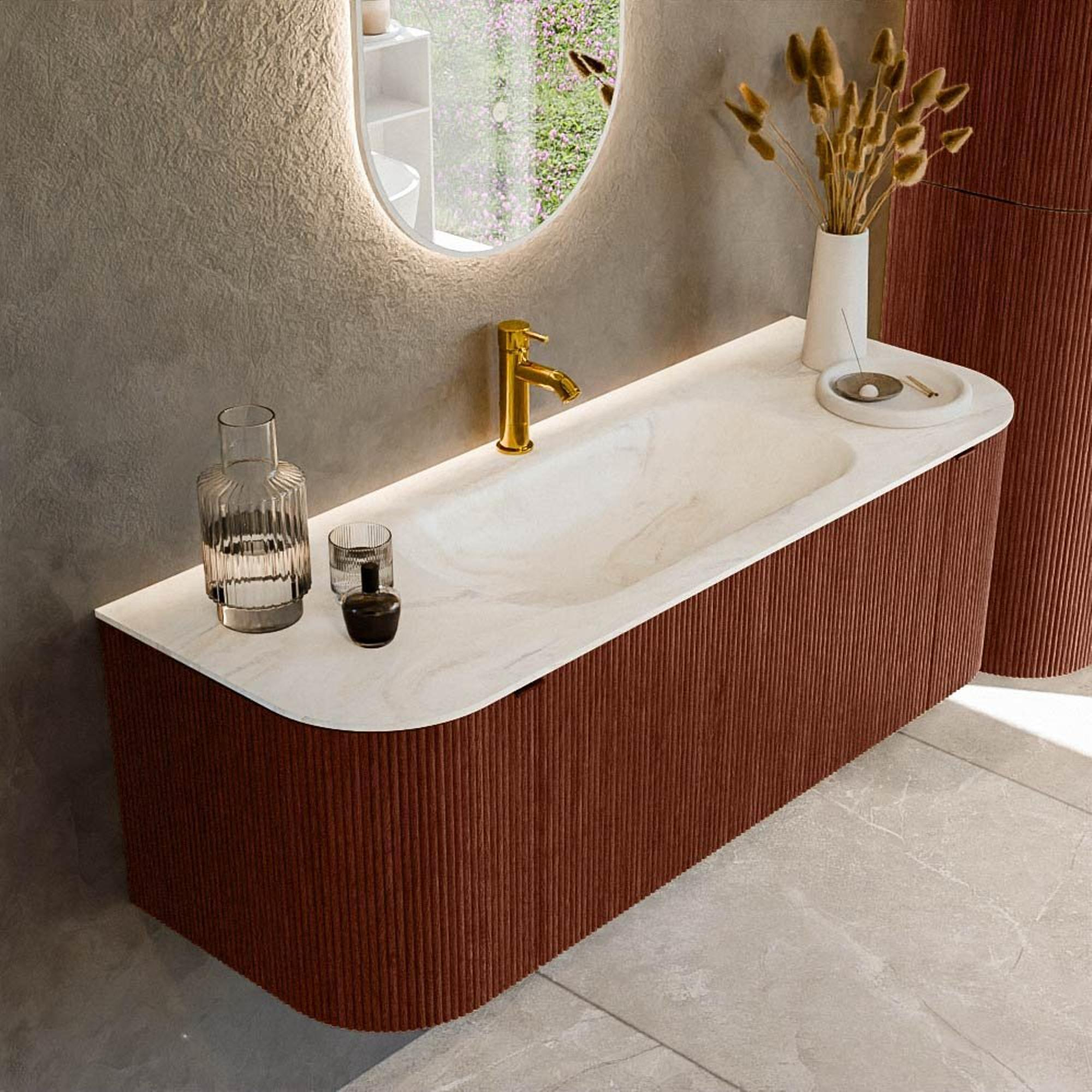 Mondiaz KURVE-DLUX Badkamermeubelset - 130x46x40cm - 1 lade - 2 deuren - wastafel solid surface - midden - 1 kraangat - Ruby