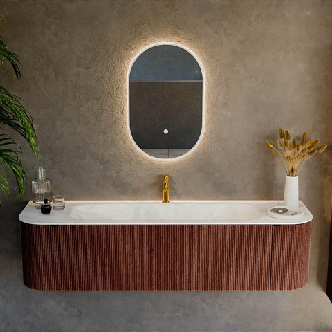 Elegant Wat meteen opvalt aan dit badkamermeubel is de elegante uitstraling. De strakke lijnen en het slanke profiel geven het een tijdloze schoonheid, waardoor het naadloos aansluit bij elke interieurstijl. Elk detail van dit meubel is ontworpen met oog voor verfijning, van de greeploze lade tot de subtiele rondingen van de wastafel. Met zijn ingetogen glans en de diepe Ruby kleur is het een waar sieraad voor jouw badkamer. Deze elegantie maakt het mogelijk om uw badkamer te transformeren tot een oase van rust en schoonheid, een plek waar je tot rust kunt komen na een drukke dag. De afwerking is zorgvuldig uitgevoerd om niet alleen visueel aantrekkelijk te zijn, maar ook duurzaam en bestand tegen de dagelijkse slijtage. De harmonie tussen functie en vorm geeft dit meubelstuk een uniek karakter, waardoor het niet alleen een gebruiksvoorwerp is, maar ook een decoratief element dat de esthetiek van jouw badkamer versterkt.