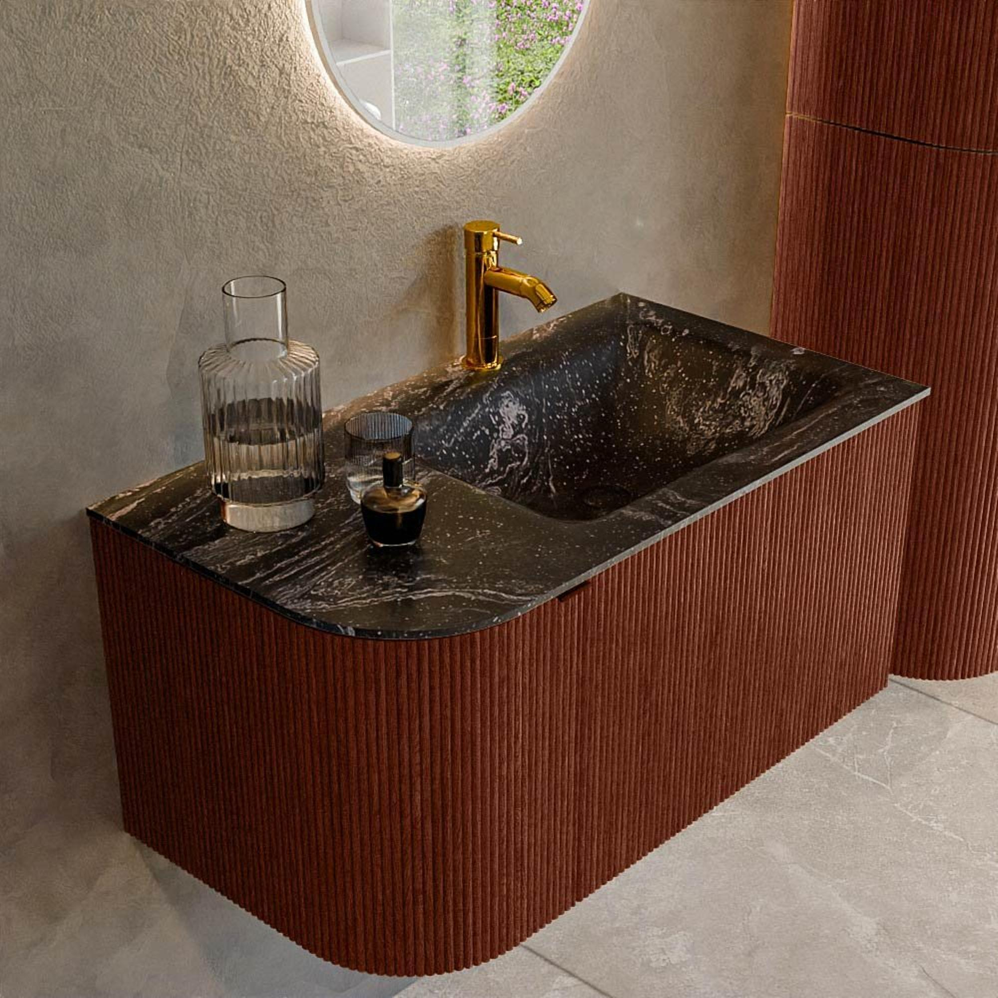 Mondiaz KURVE-DLUX Badkamermeubelset - 85x46x40cm - 1 lade - 1 deur - wastafel solid surface - rechts - 1 kraangat - Ruby