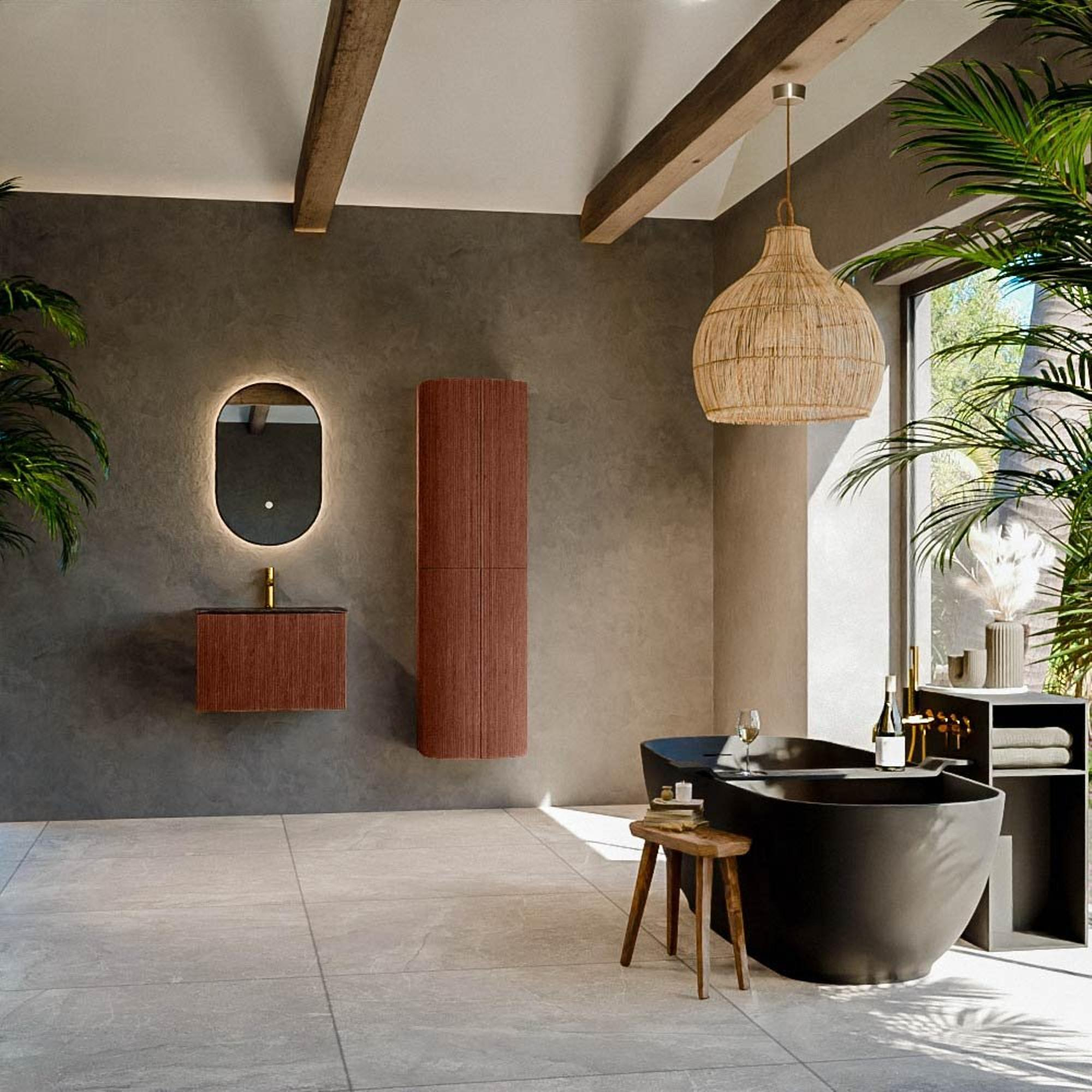 Voeg een vleugje elegantie toe aan jouw badkamer met deze prachtige badkamermeubelset. Het verfijnde ontwerp en de subtiele accenten van de set maken het tot een eenvoudige, maar toch luxueuze keuze voor elke moderne badkamer. De set beschikt over een wastafel van solid surface, die bekend staat om zijn duurzaamheid en stijlvolle uitstraling. De wastafel is centraal geplaatst en voorzien van een enkel kraangat, waardoor het ontwerp zowel functioneel als esthetisch aangenaam is. Deze combinatie zorgt ervoor dat je badkamer niet alleen een plek van comfort, maar ook van klasse wordt. De lade onder de wastafel biedt voldoende opbergruimte, zodat je al jouw badkamerbenodigdheden georganiseerd en binnen handbereik kunt houden. De afwerking in de verfijnde tint Ruby voegt een moderne flair toe die naadloos past bij zowel neutrale als gedurfde badkamerinrichtingen.