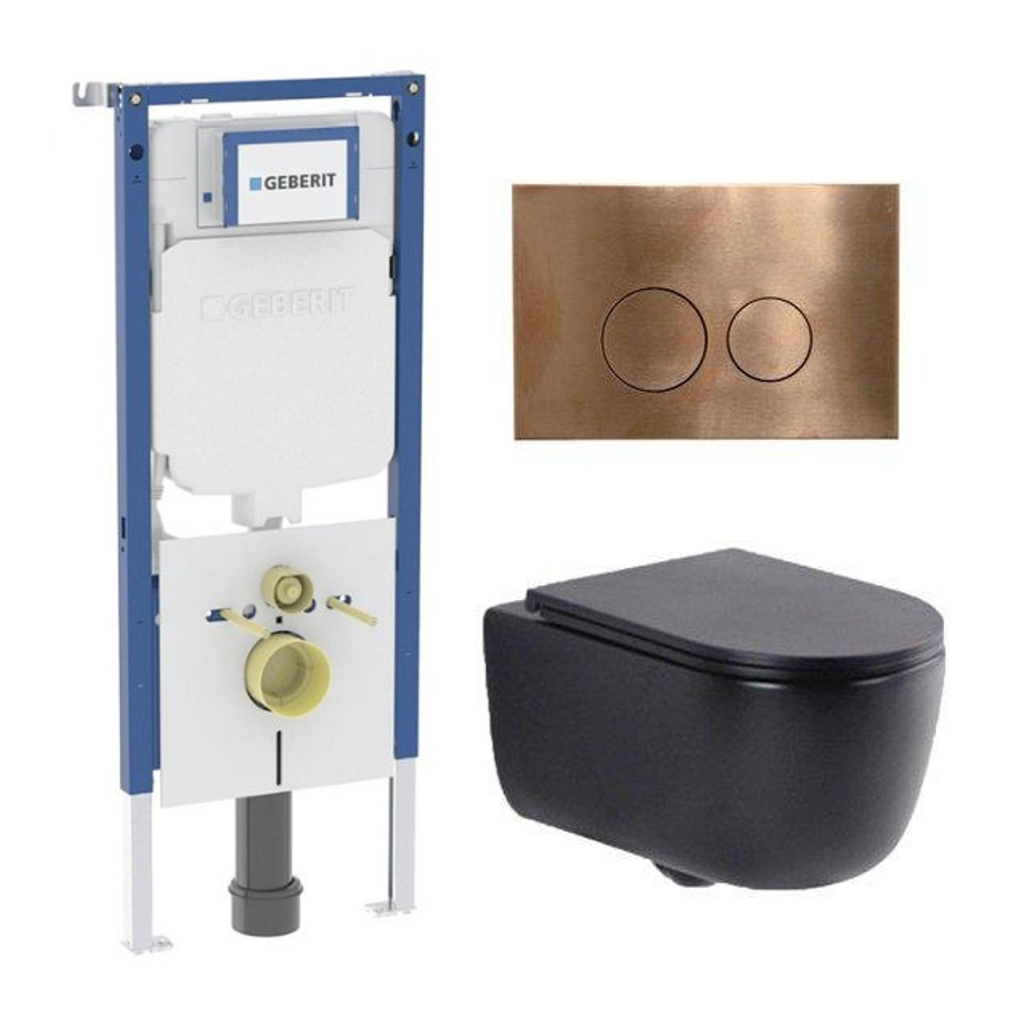 QeramiQ Dely Swirl Toiletset - 36.3x51.7cm - Geberit UP720 Duofix Sigma inbouwreservoir - slim zitting - koperen bedieningsplaat - ronde knoppen - mat zwart