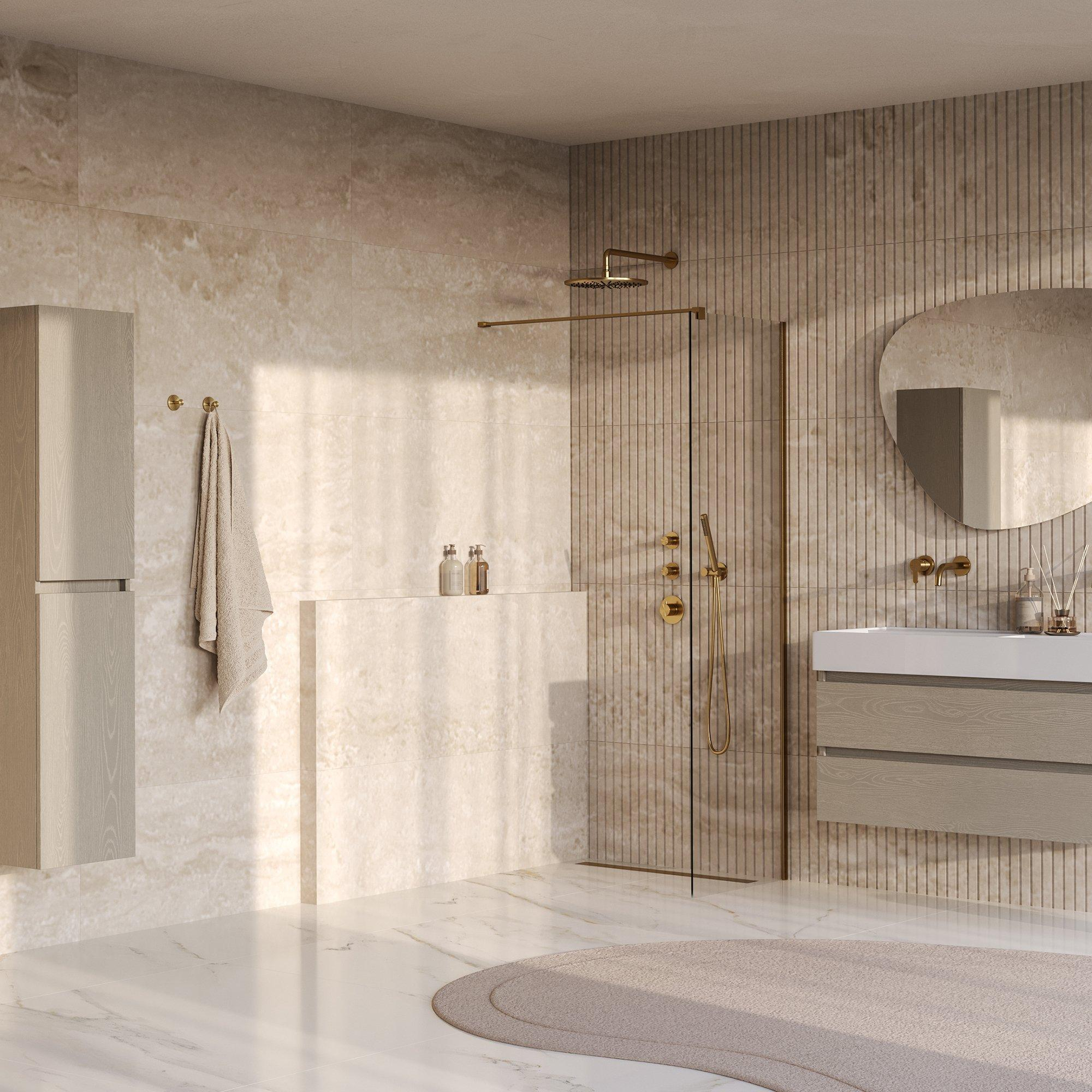 De combinatie van helder glas met een geborstelde goudkleurige PVD-afwerking maakt deze douchewand een echte blikvanger. Het strakke, moderne design past perfect in uiteenlopende badkamerstijlen, van minimalistisch tot klassiek met een twist. Door het open karakter van de inloopdouche blijft je badkamer ruimtelijk en licht, wat bijdraagt aan een ontspannen sfeer. Met deze stijlvolle keuze geef je jouw badkamer een exclusieve uitstraling die je gasten zeker zullen bewonderen.