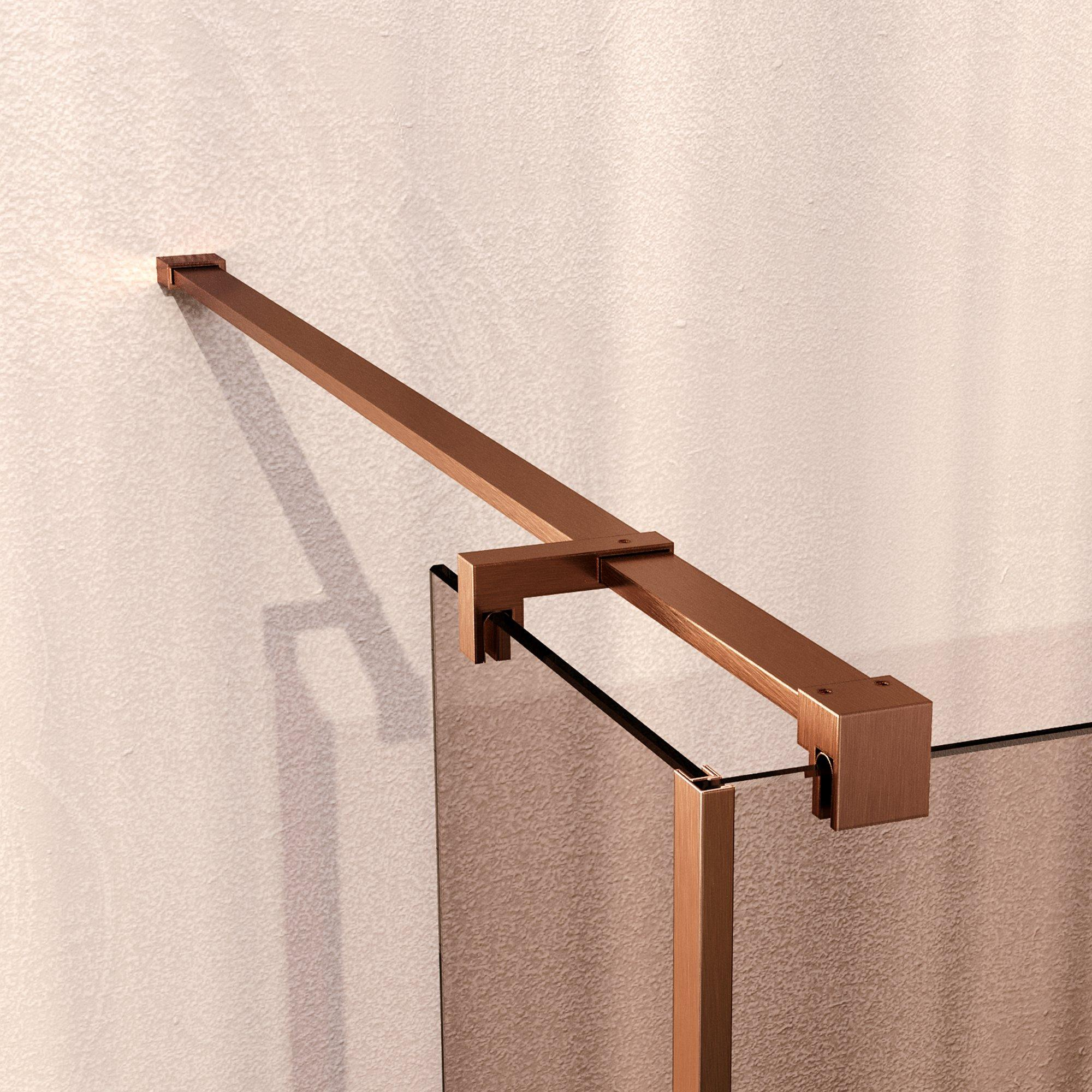 Stap binnen in een wereld van luxe en verfijning met deze inloopdouche die jouw badkamer direct een stijlvolle en moderne uitstraling geeft. Het warme bronzen glas in combinatie met de geborstelde koperkleurige afwerking zorgt voor een unieke sfeer waarin comfort en design samenkomen. Dankzij de royale afmetingen van 100x200 cm en de praktische zijwand van 30 cm geniet je van een ruime douche-ervaring zonder concessies te doen aan elegantie. De hoogwaardige glascoating beschermt tegen kalkaanslag en maakt het schoonmaken een stuk eenvoudiger, zodat je langer kunt genieten van de stralende glans. Deze inloopdouche transformeert jouw badkamer tot een oase van rust en stijl, waar je elke dag weer met plezier onder de douche stapt.